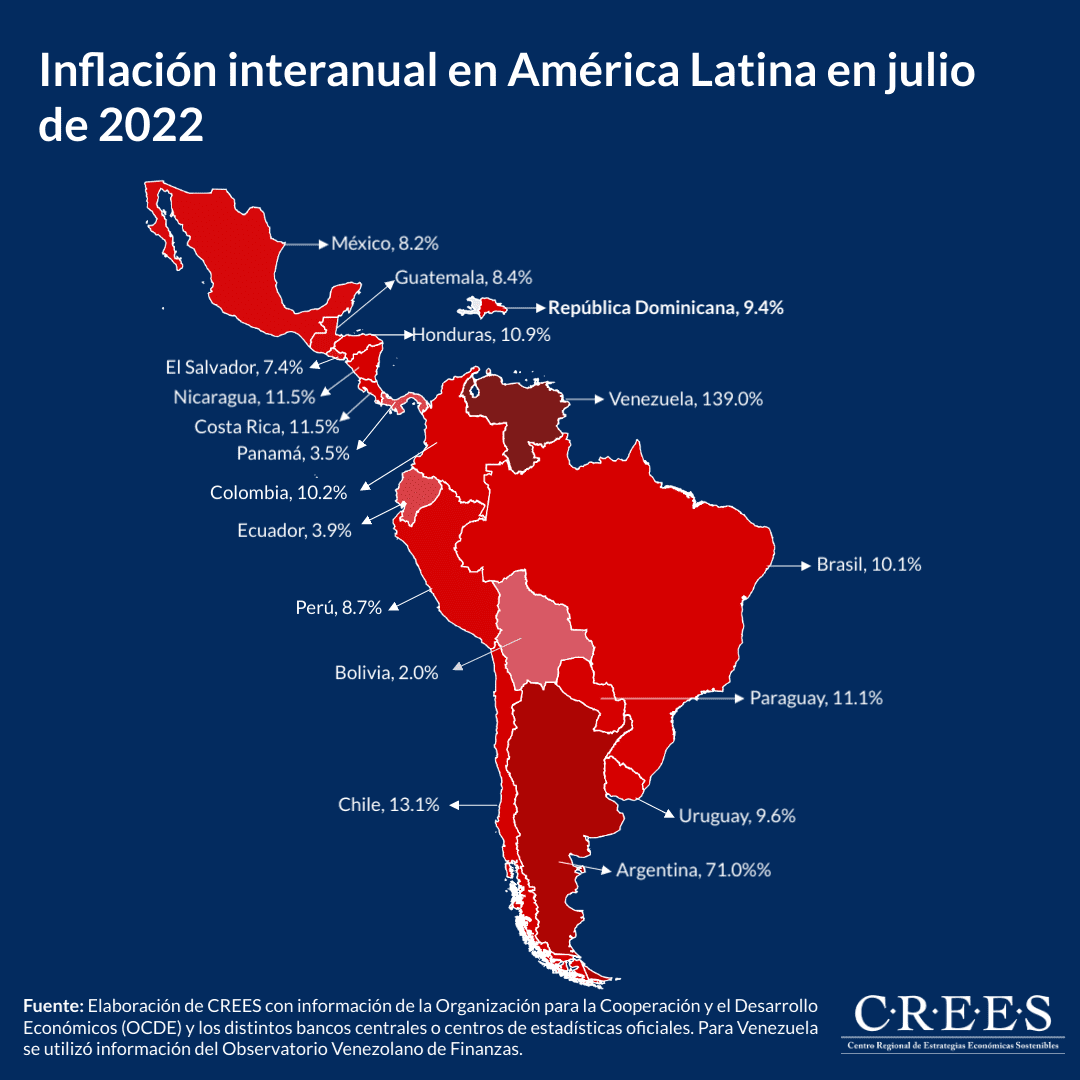 En julio de 2022 en República Dominicana se registró incremento interanual de precios de 9.4%; el país número once con mayor inflación en la región. En este mismo mes los países de América Latina con mayor incremento interanual en sus precios fueron Venezuela (139%), Argentina (71.0%), Chile (13.1%) y Costa Rica (11.5); mientras que los de menor incremento fueron Bolivia (2.0%) y, dos economías dolarizadas, Panamá (3.5%) y Ecuador (3.9%).