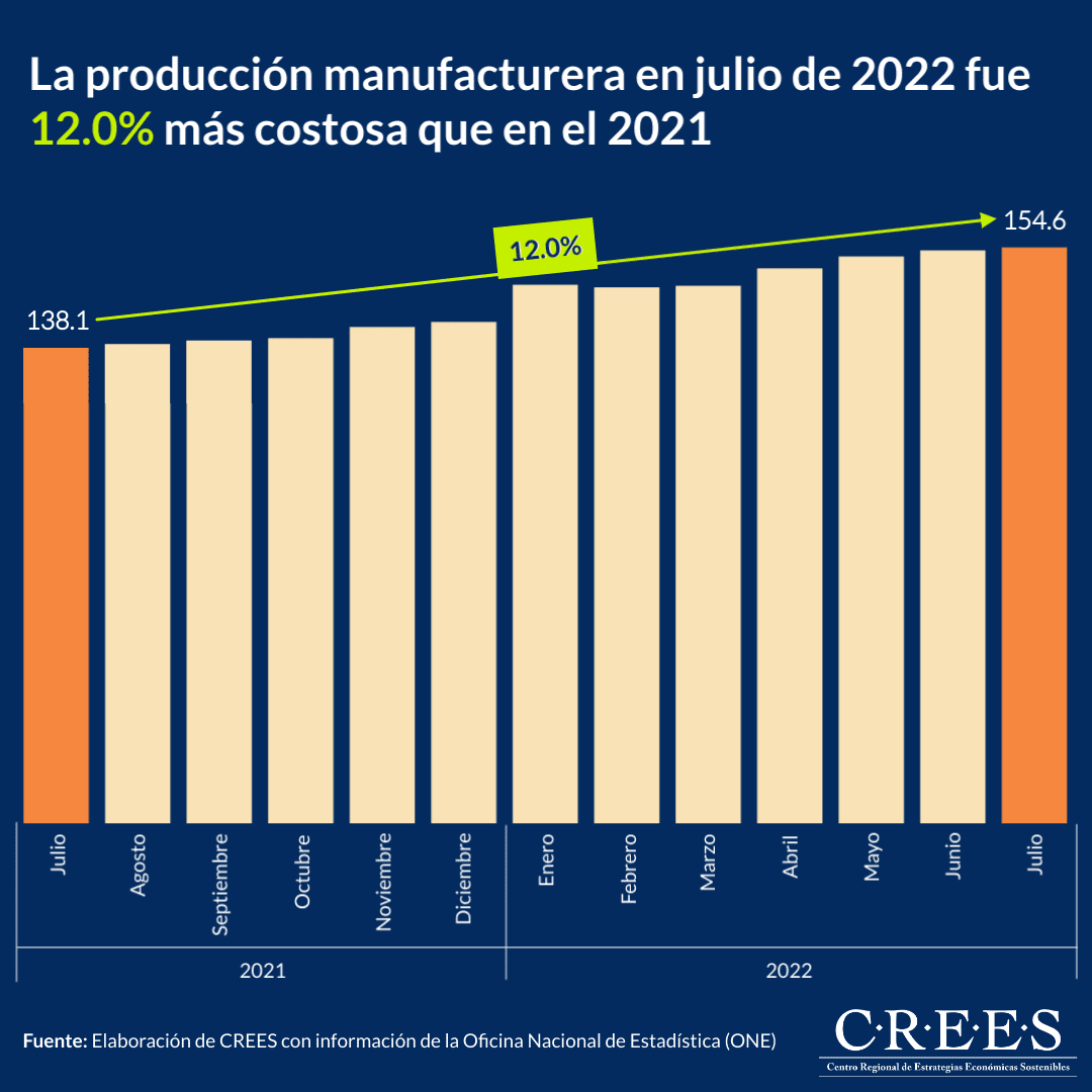 En julio de 2022 el Índice de Precios del Productor (IPP) de las Industrias Manufactureras elaborado por la Oficina Nacional de Estadística (ONE) fue de 154.6, reflejando una variación interanual de 12.0%. De igual forma, con respecto al mismo mes del año 2020 presentó un incremento de 23.2%. Es decir que la producción manufacturera en República Dominicana se ha vuelto 12.0% más cara que en el año 2021 y 23.2% más cara que en el año 2020, en promedio.