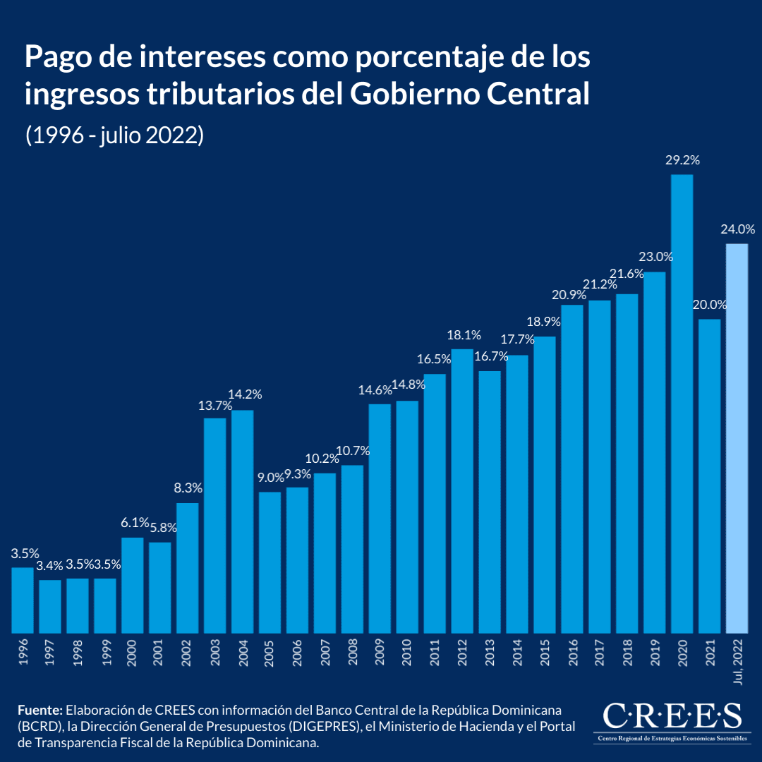 De acuerdo con los datos de la Dirección General de Presupuesto, a julio de 2022 la relación de pago de intereses de la deuda como porcentaje de los ingresos tributarios del Gobierno Central ascendía a 24.0%.