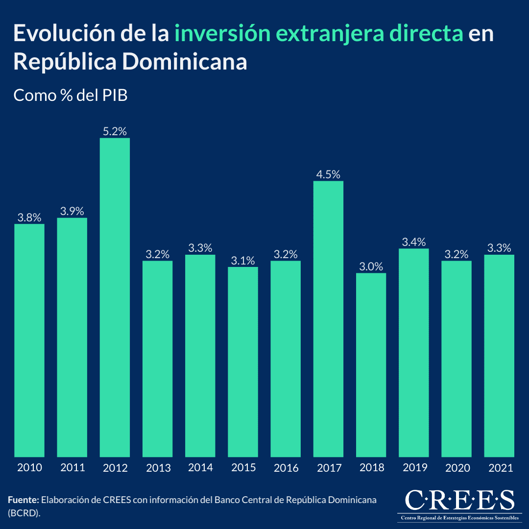 Una mirada a la evolución de la inversión extranjera directa (IED) como porcentaje del producto interno bruto (PIB) nos muestra como, con excepción de los años 2012 y 2017, la participación de esta inversión en la economía dominicana se ha mantenido estancada en el rango de 3.0% a 3.9% en los últimos 11 años.