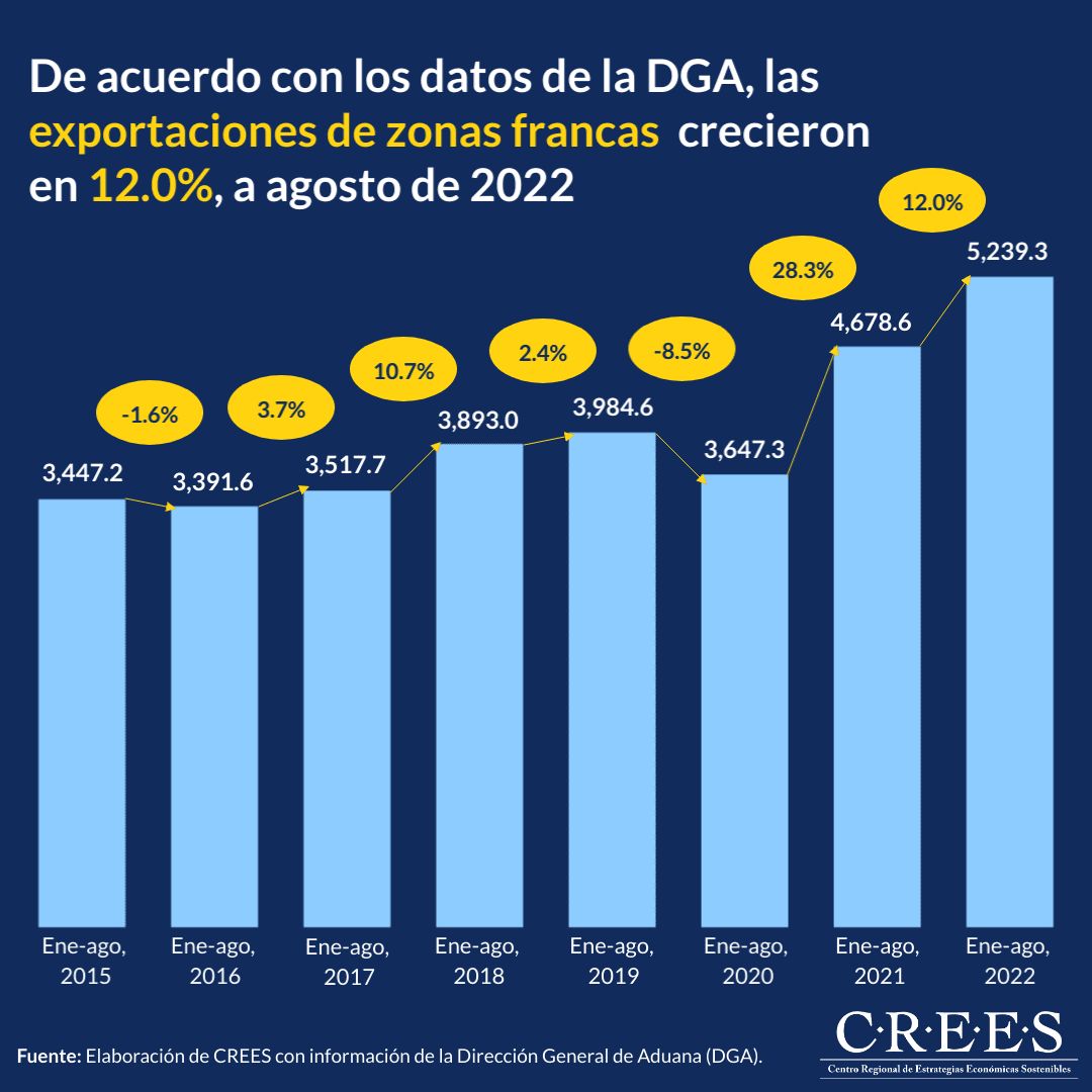 De acuerdo con los datos de la Dirección General de Aduanas (DGA), las exportaciones de las empresas de zonas francas en la República Dominicana crecieron en un 12.0% en el periodo enero-agosto de 2022; registrando US$560.8 millones más en comparación con lo registrado en el mismo periodo del año 2021. De igual forma, con respecto al periodo enero-agosto de 2020, crecieron en un 43.6%; registrando unos US$1,592.0 millones más. Es importante tener en cuenta que este crecimiento en términos reales es menor debido a la inflación mundial; en particular, en agosto de 2022 la inflación interanual de Estados Unidos –nuestro principal mercado– fue de 8.3%.