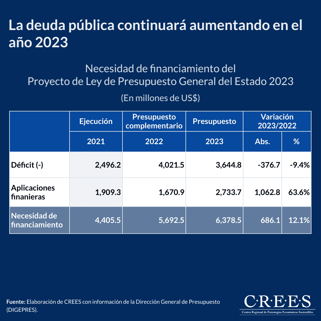 De acuerdo con el Proyecto de Ley de Presupuesto General del Estado 2023, el déficit del Gobierno Central en 2023 ascenderá a US$3,644.8 millones. Si a este déficit se le suman los US$2,733.7 millones de aplicaciones financieras presupuestados, la necesidad de financiamiento para el 2023 ascenderá a US$6,378.5 millones. Es decir, un incremento de 12.1% en comparación con lo contemplado para este año en el presupuesto complementario 2022; equivalente a US$686.1 millones más.
