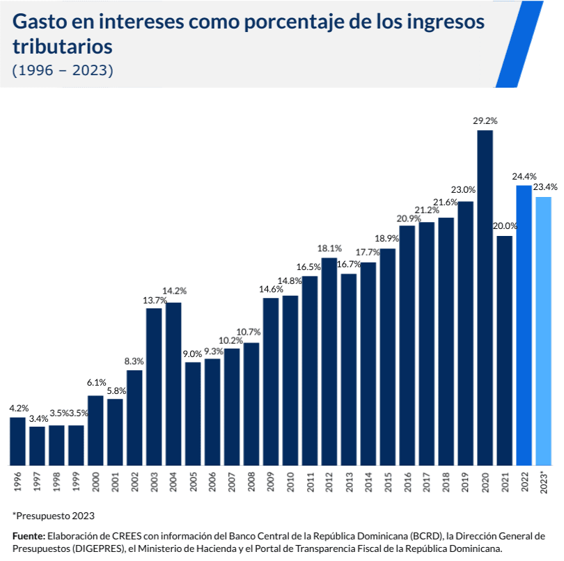 Si bien es común analizar la deuda como porcentaje del producto interno bruto, lo cierto es que la deuda no se paga con el PIB; la deuda se paga con los ingresos del gobierno por medio de las recaudaciones de los impuestos. Es por esta razón que entre los gráficos mostrados se encuentra la evolución del gasto en intereses como porcentaje de los ingresos tributarios (GIIT) de República Dominicana. El GIIT es un indicador que refleja la liquidez del gobierno para hacer frente a los compromisos de la deuda. Un incremento en el gasto en intereses, independientemente de la relación deuda/PIB, coloca a todo estado en una situación en la cual es más difícil hacer frente a sus compromisos financieros.