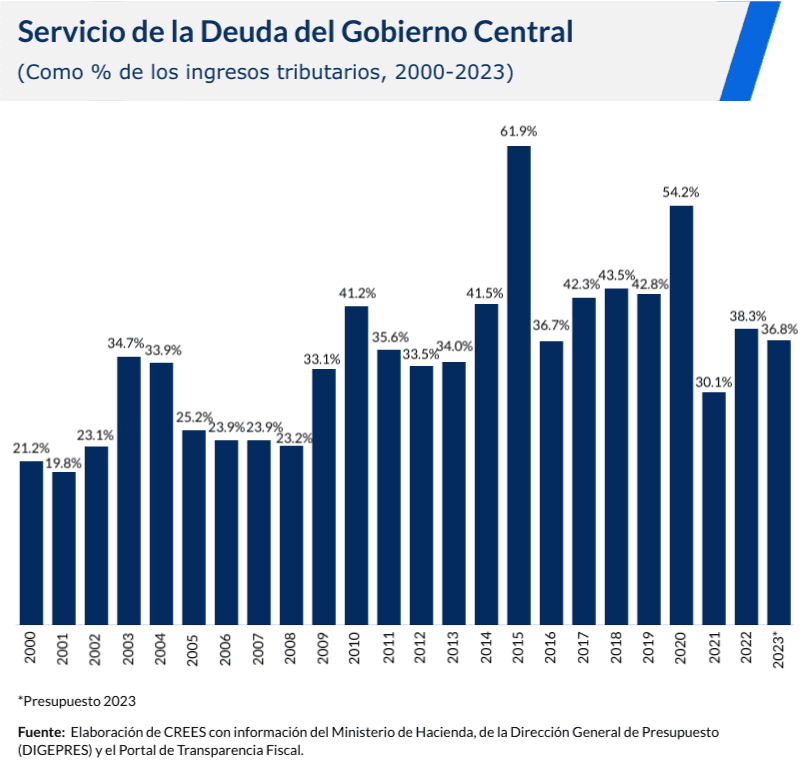 De acuerdo con el presupuesto original para el año 2022 el gasto en intereses iba a representar un 24.9% de los ingresos tributarios. Sin embargo, debido a que las recaudaciones de impuestos actualmente están por encima de lo estimado y, a la apreciación del tipo de cambio, esta relación es menor y se estima que ascenderá a 24.4%. A pesar de la reducción del GIIT, los compromisos de la deuda continúan teniendo un peso importante sobre los ingresos. Según el presupuesto 2023, el pago de intereses representará un 23.4% de los ingresos tributarios del próximo año.