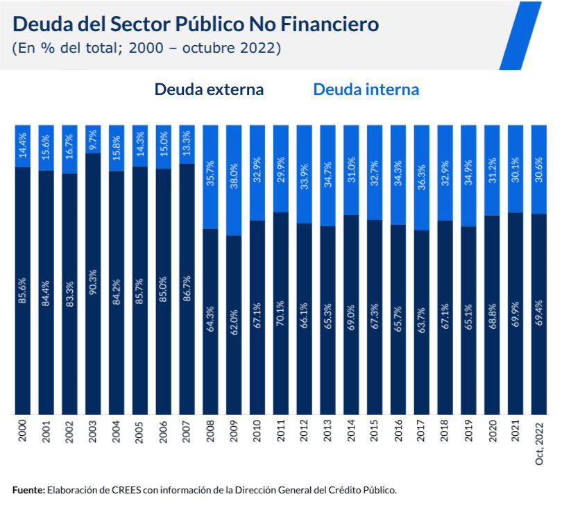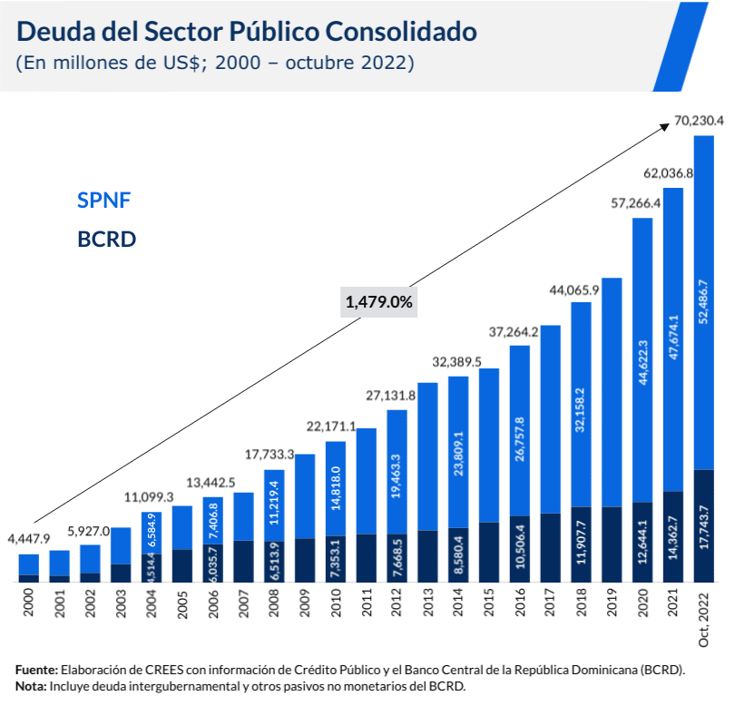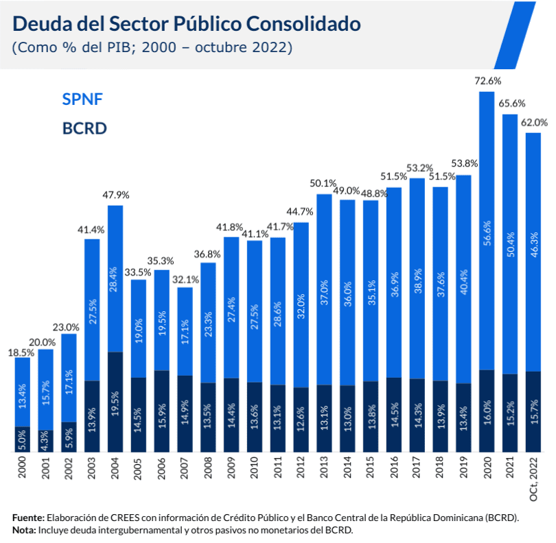 A octubre de 2022 la deuda pública consolidada de República Dominicana (incluyendo deuda intergubernamental) ascendió a US$70,230.4 millones, de los cuales US$52,486.7 millones correspondían a la deuda del SPNF y los restantes US$17,743.7 millones provenían de los pasivos del BCRD. Como porcentaje del PIB, la deuda del SPNF representó un 46.3% y la del BCRD representó un 15.7%; ubicando así la deuda pública consolidada en 62.0% del PIB en septiembre de 2022.