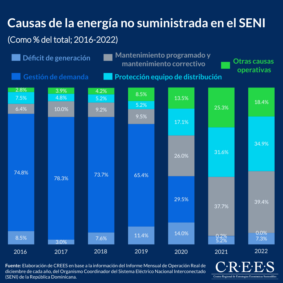 En 2022, la principal causa de energía no suministrada (el 39.4%) fue por mantenimiento, ya sea programado o correctivo. A esto le siguen protección de equipos de distribución, que representó un 34.9%, y déficit de generación que representó un 7.3%.