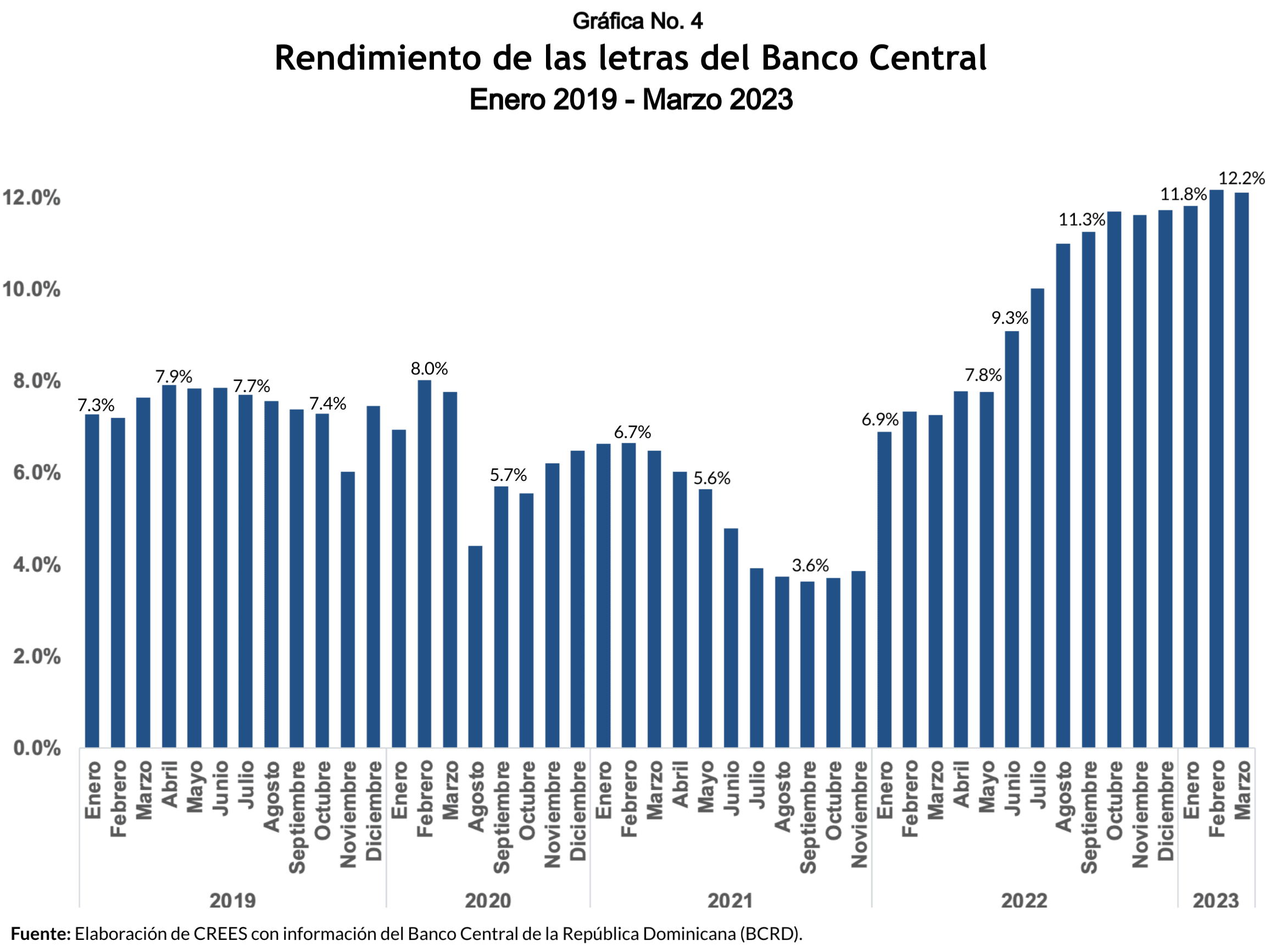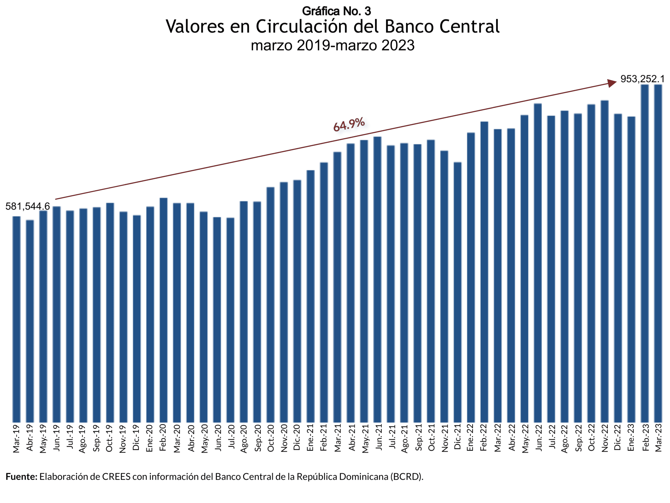 La deuda total del Estado dominicano creció en 53.6% entre diciembre de 2019 y febrero de 2023, de acuerdo con nuestros estimados. En este sentido, el balance de la deuda del Banco Central de la República Dominicana creció en 59.0% al pasar de US$11,918.0 en diciembre de 2019 a US$18,955.5 en febrero de 2023. La institución emisora ha tenido que lidiar con la liquidez creada por las medidas tomadas en 2020 que aumentaron el crédito e hicieron crecer la oferta monetaria (M2) en 33.8% entre diciembre 2019 y diciembre 2022; y con mayores intereses pagados por los títulos de deuda emitidos, el principal componente de sus pasivos no monetarios. Tanto las letras y las notas que emite el ente emisor de moneda se están colocando con rendimientos superiores a los que prevalecían antes del cambio en la política monetaria, que fue necesario establecer luego de los aumentos de precios como consecuencia de la inflación monetaria.