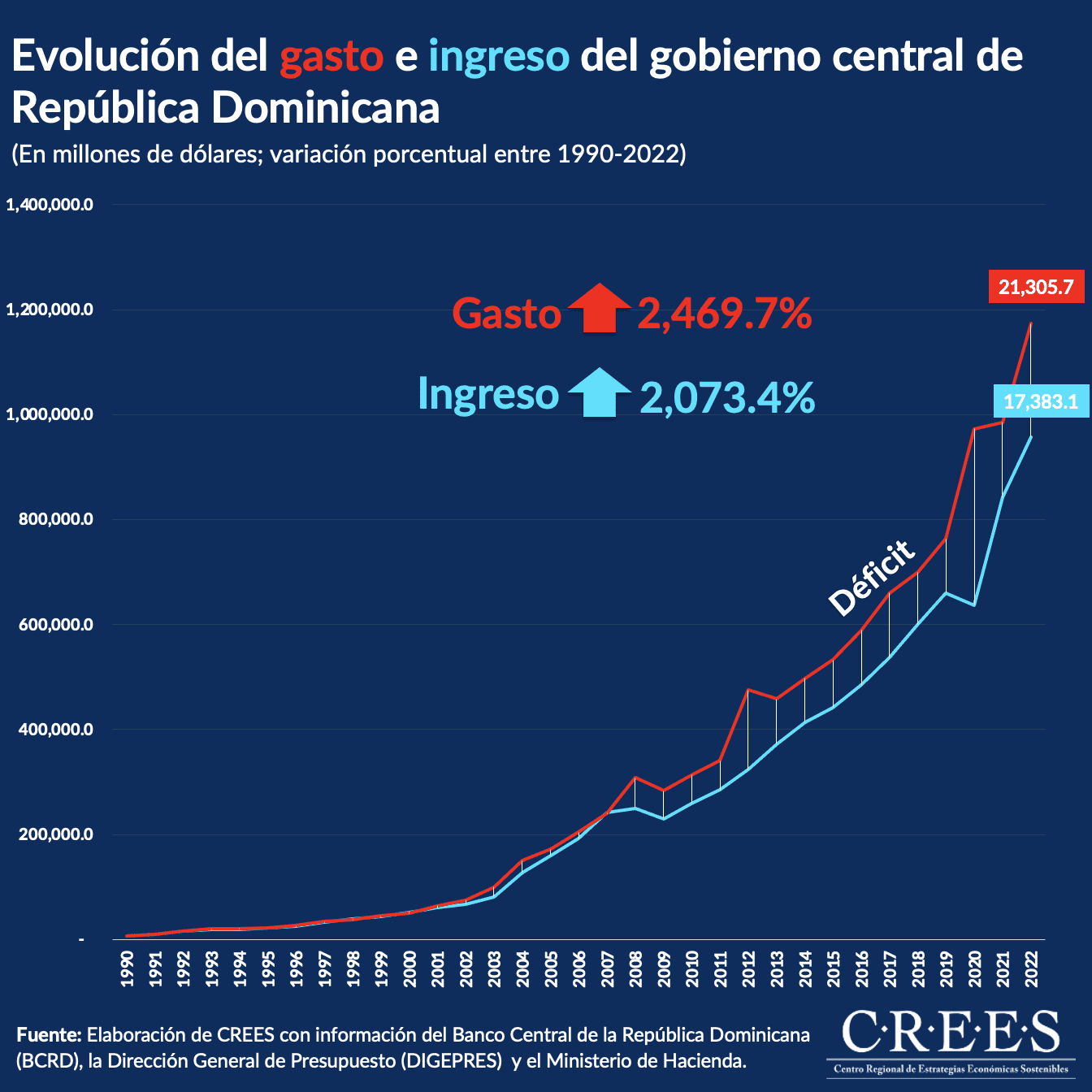 Al analizar los datos de los ingresos y los gastos del gobierno de República Dominicana desde el año 1990 hasta el 2022, se aprecia cómo se han comportado los déficits fiscales. En la década de los años 1990, las autoridades mantuvieron, en promedio, una política de supéravit fiscal. El gobierno se manejó con prudencia; lo que permitió reducir la deuda pública en ese periodo.
