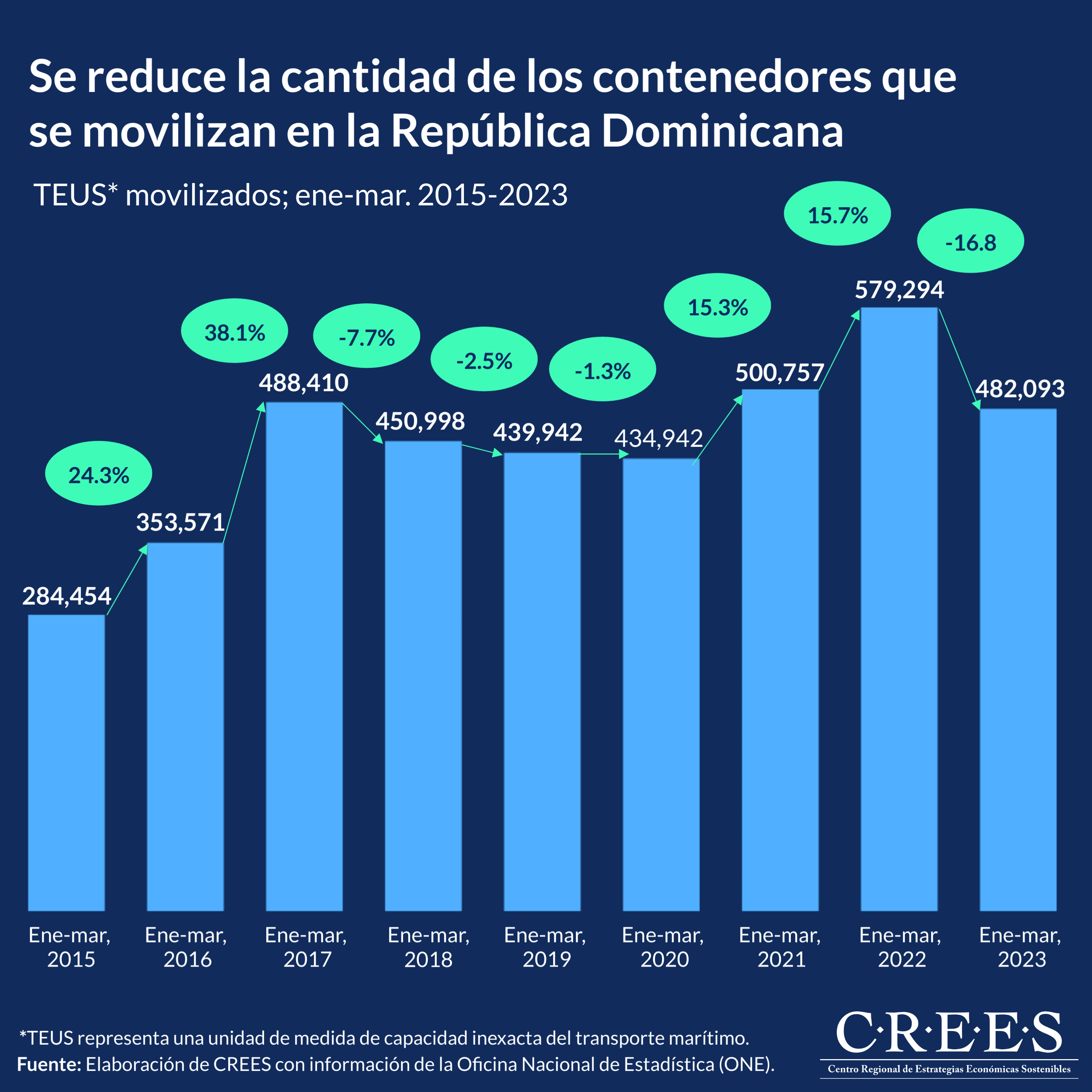 Según los datos de la Oficina Nacional de Estadística (ONE), en el primer trimestre del año 2023 el volumen de importaciones y exportaciones marítimas de la República Dominicana que se movilizo por los puertos del país fue de 482,093 TEUS. En comparación con el volumen del mismo periodo del año 2022 se verificó una reducción de un 16.8% en la actividad portuaria.