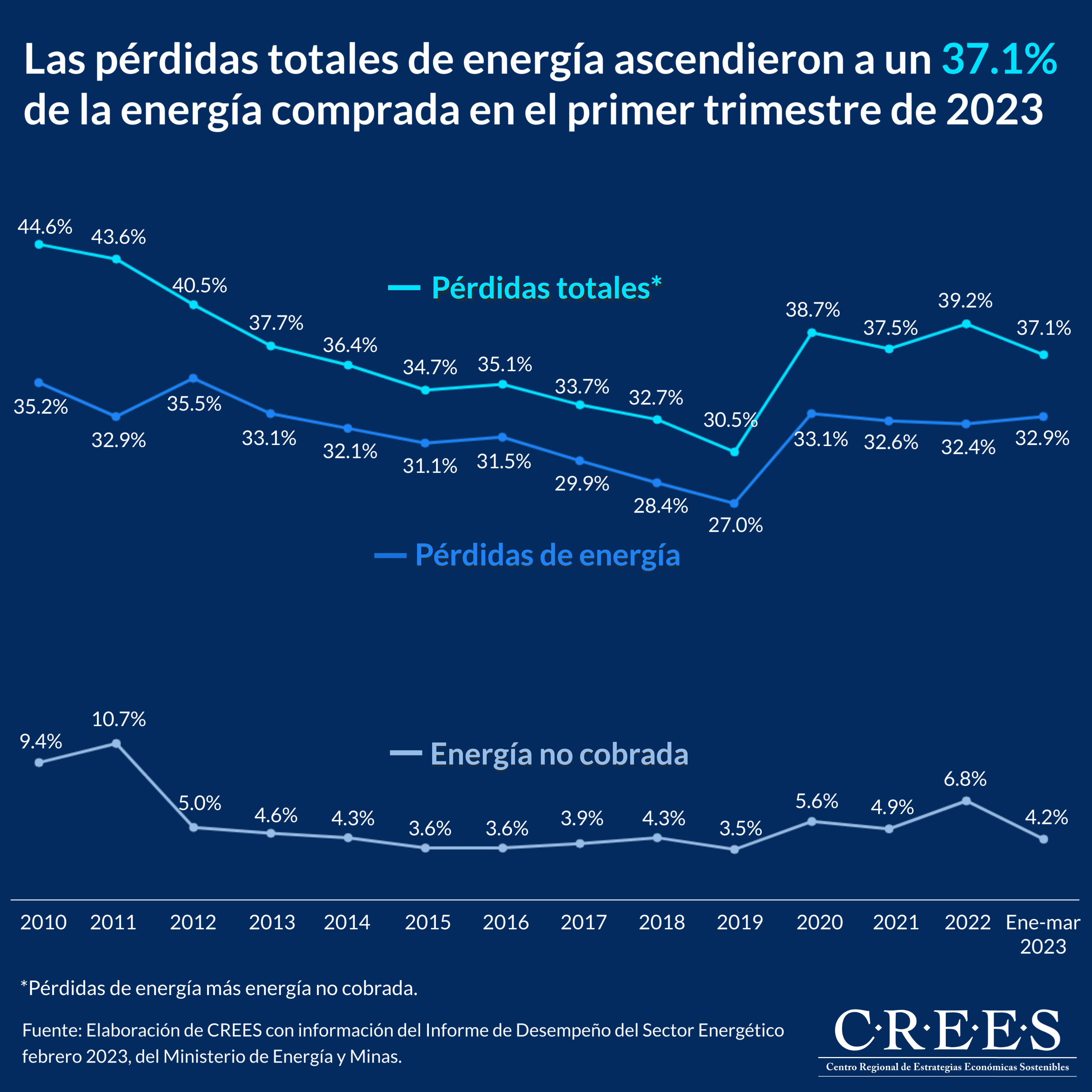 Las pérdidas totales de energía ascendieron a un 37.1% de la energía comprada en el primer trimestre de 2023