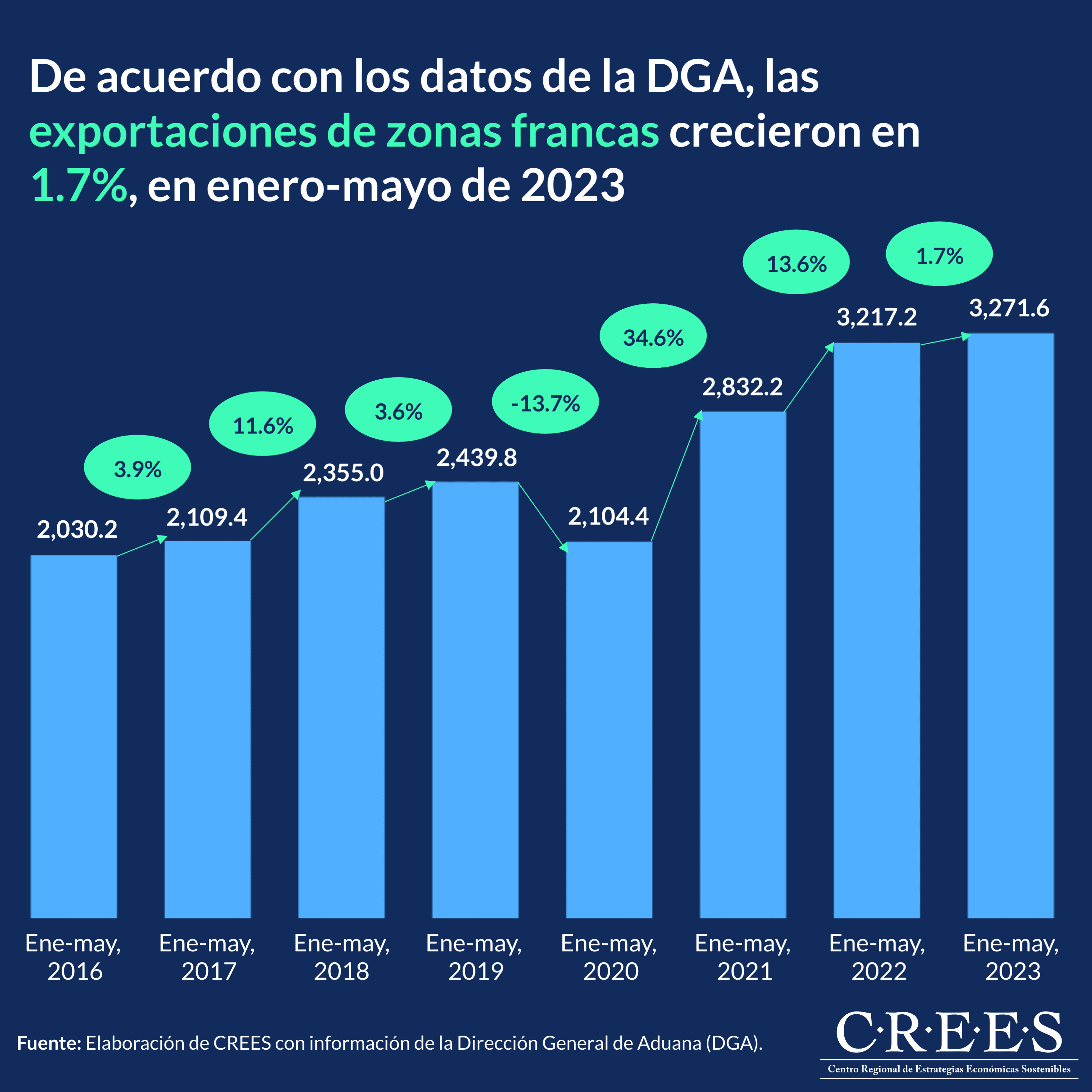 Entre enero y mayo de 2023 las exportaciones totales de bienes ascendieron a US$5,116.4 millones; de los cuales las de zonas francas representan más de la mitad (un 63.9%).