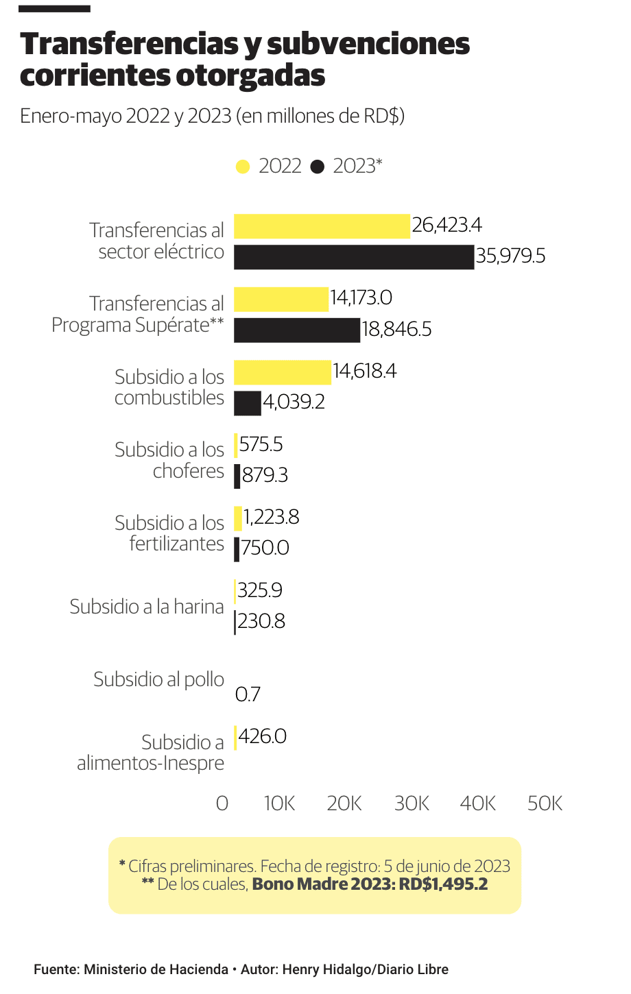 Lo traspasado al sector eléctrico es el mayor de un paquete de transferencias y subvenciones corrientes otorgadas por el gobierno, al menos entre enero y mayo de los años 2022 y 2023, de acuerdo a datos entregados desde el Ministerio de Hacienda a solicitud de Diario Libre.