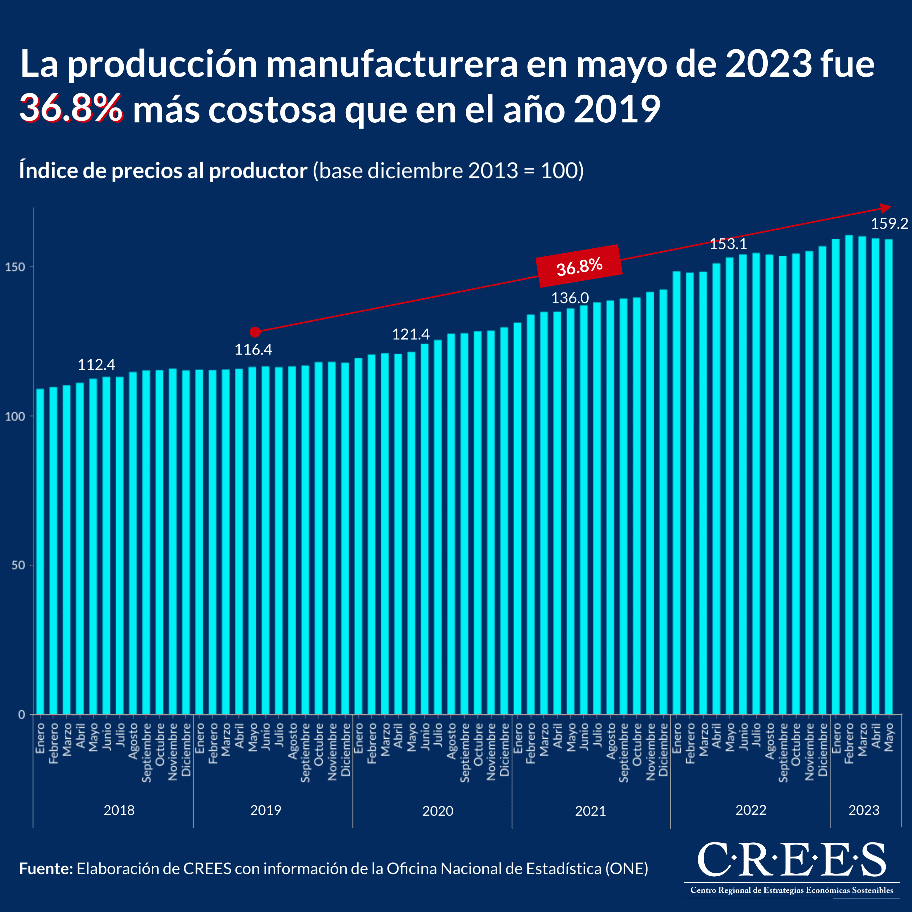 En mayo de 2023 el Índice de Precios del Productor (IPP) de las Industrias Manufactureras elaborado por la Oficina Nacional de Estadística (ONE) fue de 159.2, reflejando una variación interanual de 4.0%; la cifra de variación interanual más baja desde principios del año 2020. Sin embargo, a pesar de la desaceleración en el ritmo de crecimiento de los precios, el costo de la producción manufacturera aún se mantiene alto.