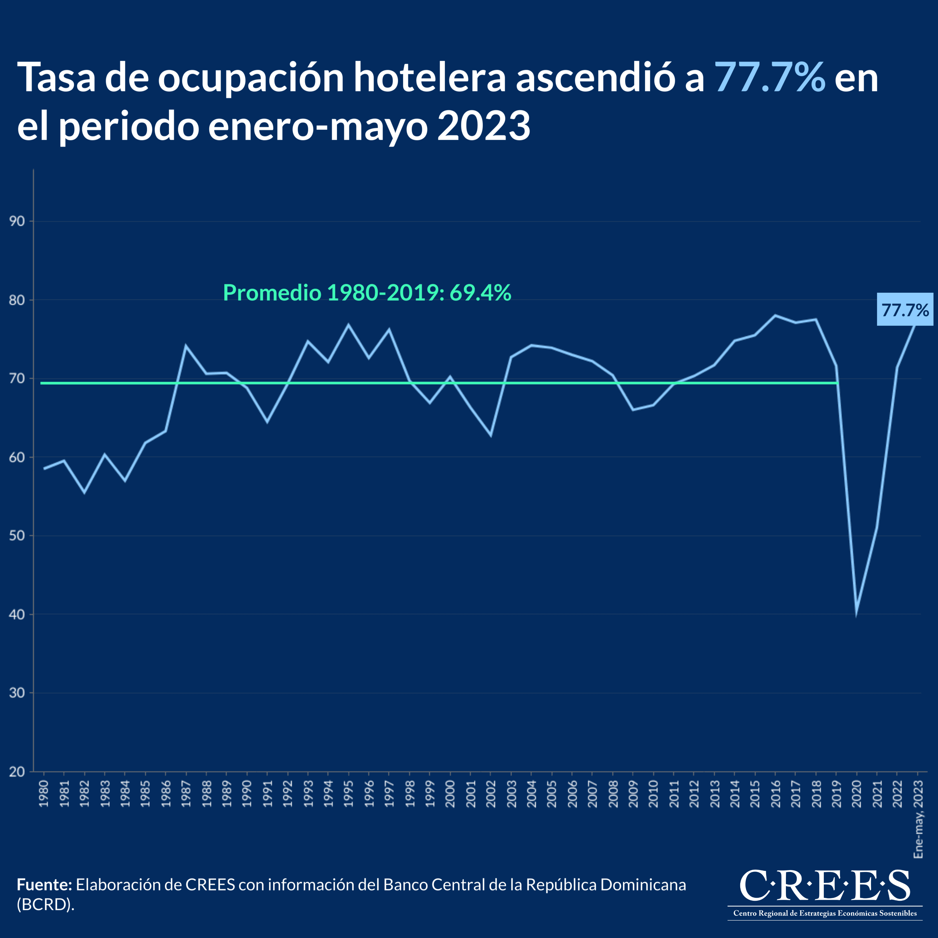 En el periodo enero-mayo del 2023 la tasa de ocupación hotelera promedio fue de 77.7%. Esto significa que la ocupación hotelera estuvo 8.3 puntos porcentuales por encima de la tasa promedio anual de los últimos 40 años previos a la pandemia (1980-2019) de 69.4%.