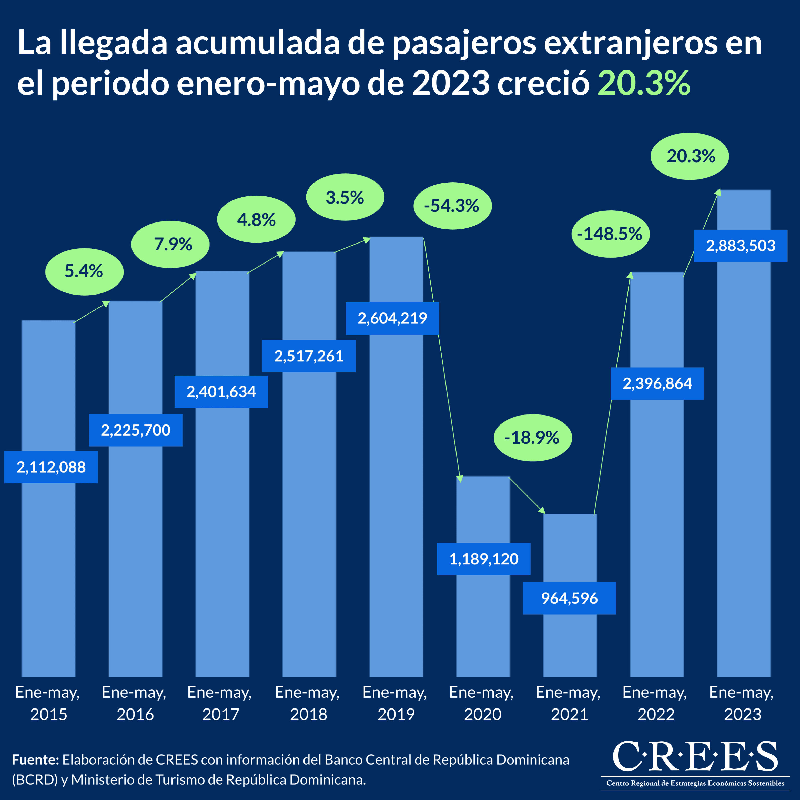 A mayo de 2023 se registró un total de 3,748,044 visitantes no residentes, es decir, tanto extranjeros como dominicanos que ingresaron al país por los diferentes aeropuertos internacionales. Esta cifra significa una diferencia de 477,109 visitantes más con respecto al mismo periodo del 2022 y una diferencia de 1,944,285 más con respecto al 2021.