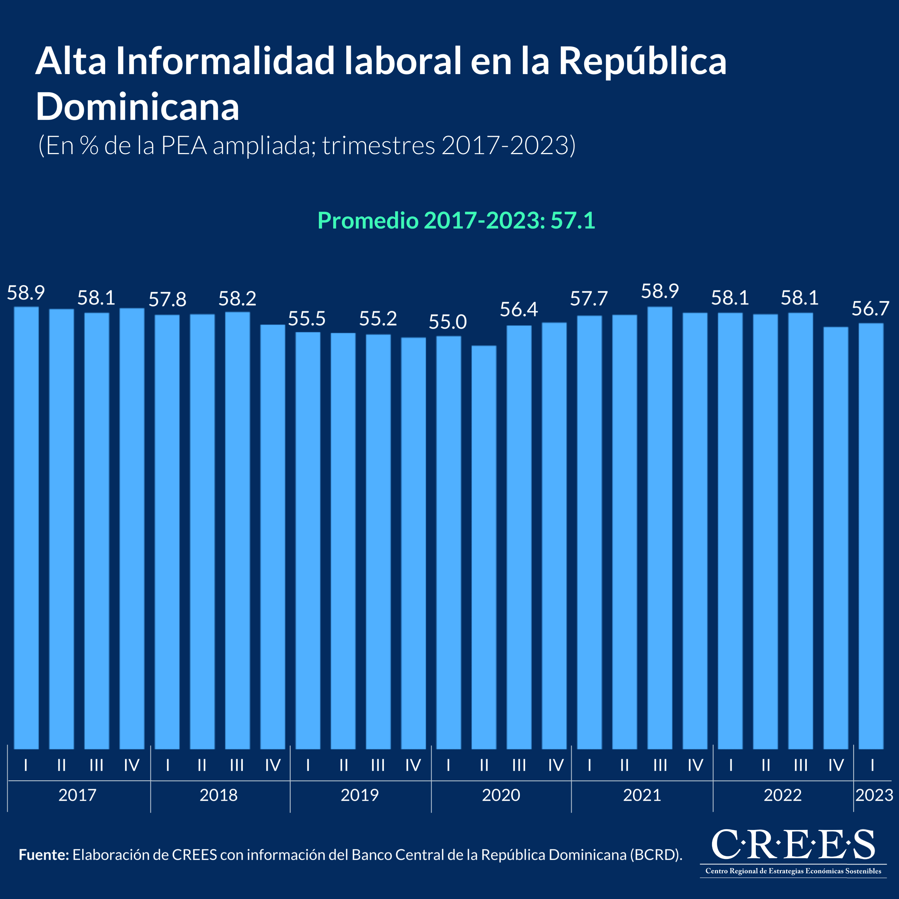 De acuerdo con las cifras oficiales sobre el mercado laboral dominicano, en el primer trimestre de 2023 la informalidad rondaba el 57%. Esta es una cifra superior al 55% de antes de la pandemia de Covid-19, y no muy diferente del promedio histórico.