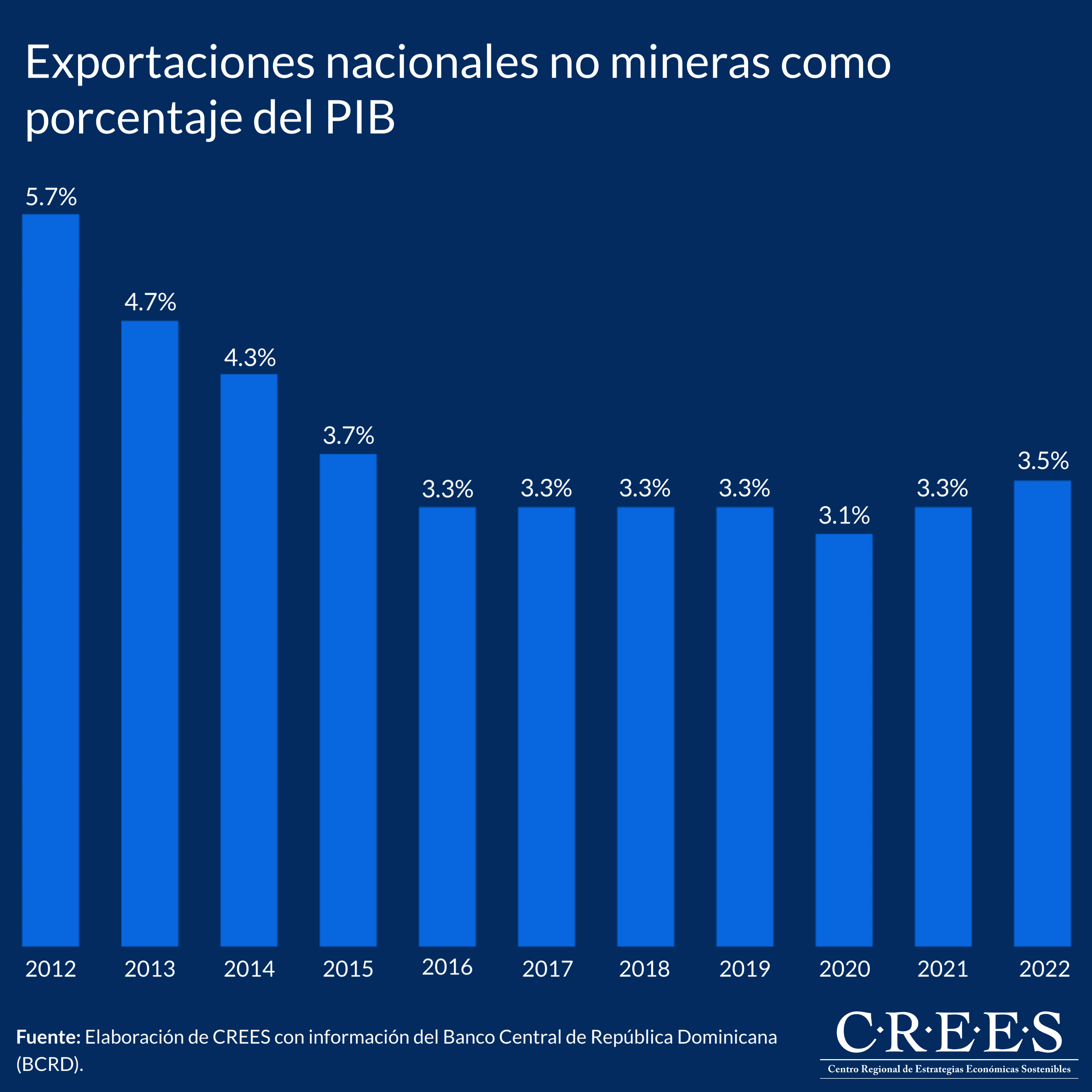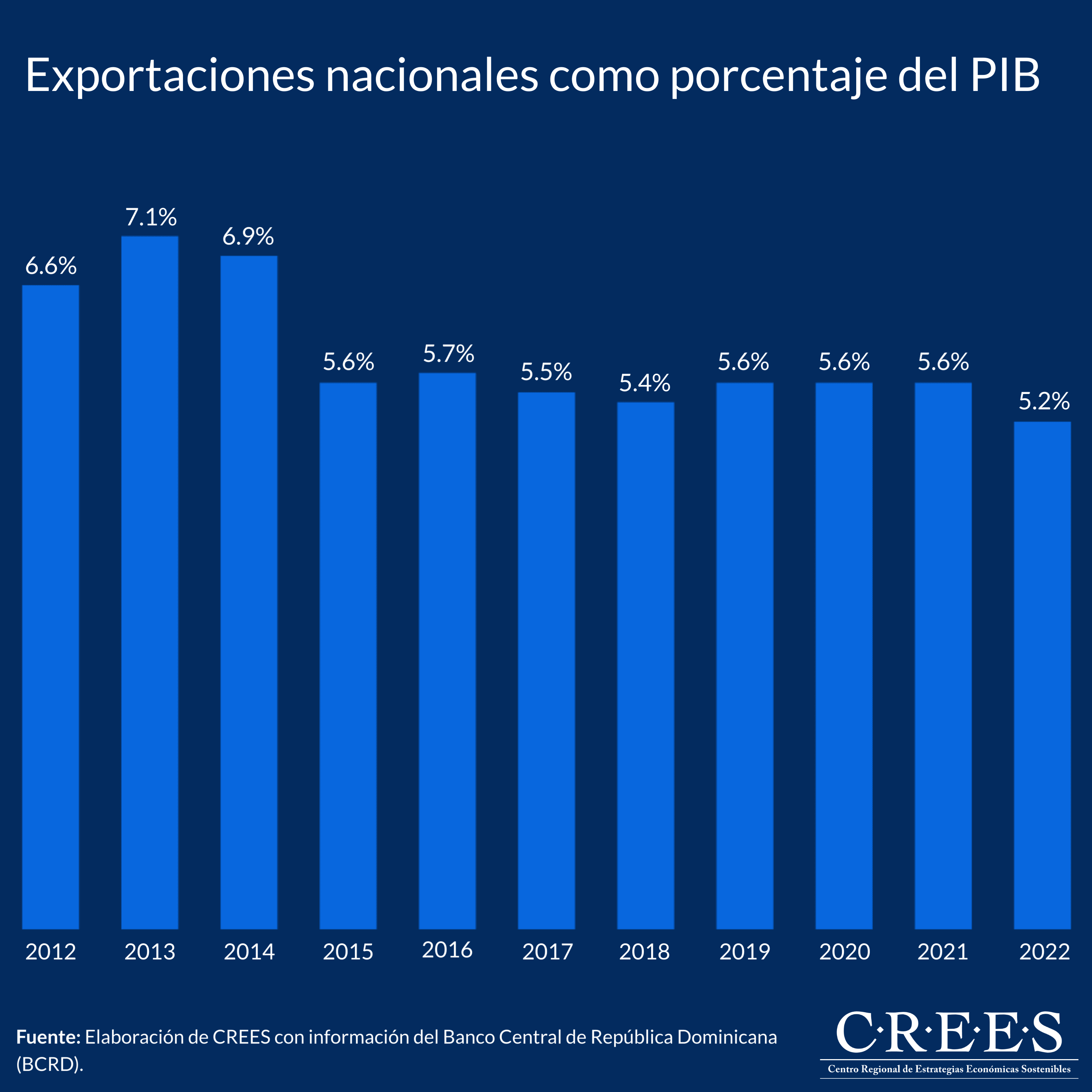 Las exportaciones nacionales de República Dominicana mostraron una reducción en términos relativos en 2022, y un estancamiento en los siete años previos. Cuando se calculan de forma relativa, es decir, como porcentaje del PIB, las exportaciones del país, sin incluir las zonas francas, no muestran crecimiento en los últimos ocho años.