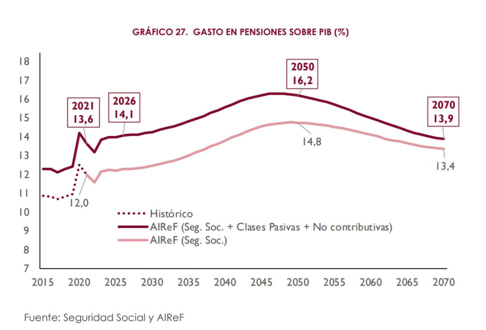 Además, la AIReF pronostica que “el gasto en pensiones empezaría a acelerarse especialmente a partir de 2035, con un máximo del 16,3% del PIB en 2049″.