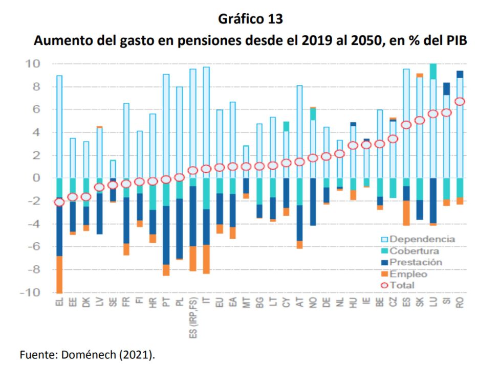Relacionado con lo anterior, asimismo podemos comprobar cuál será “el aumento en el gasto en pensiones sobre el PIB en las próximas tres décadas (2019-2050), para cada uno de los países europeos, para las tasas de Dependencia, Cobertura, Prestación y Empleo y, en un círculo, el total”.