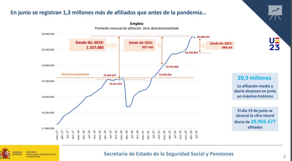 Uno de los datos que conviene recordar es el de la proporción de cotizantes respecto de pensionistas. De acuerdo con la Seguridad Social, el pasado mes de junio se alcanzó los 20.956.577 millones de afiliados, mientras que en ese mismo mes el número total de pensionistas fue de 9.092868 y se pagaron un total de 10.040.732 de pensiones. Así, obtenemos una proporción de 2,3 cotizantes por pensionistas (en un mes, eso sí, en el que ha habido un repunte en las altas en la Seguridad Social). Es decir, una única pensión es financiada prácticamente sólo por dos trabajadores. Y cuando se agraven los efectos de la crisis demográfica, también lo hará aún más la sostenibilidad del sistema de pensiones.