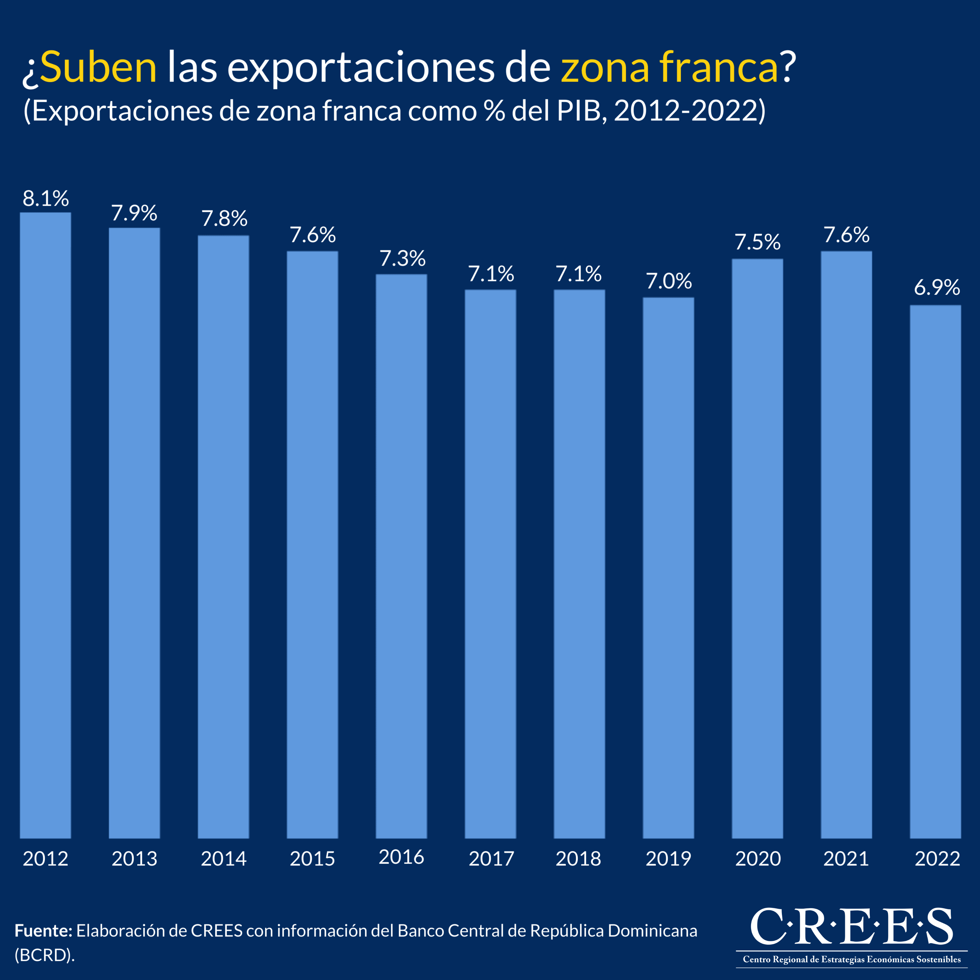 En términos absolutos las exportaciones de zonas francas han aumentado constantemente desde el 2012, pero, en términos relativos al producto interno bruto (PIB) se ha reducido en la mayoría de los periodos(exceptuando los afectados por la pandemia de Covid-19). En el periodo analizado es decir, entre el 2012 y el 2022 el promedio de las exportaciones de zonas francas representó 7.5%.