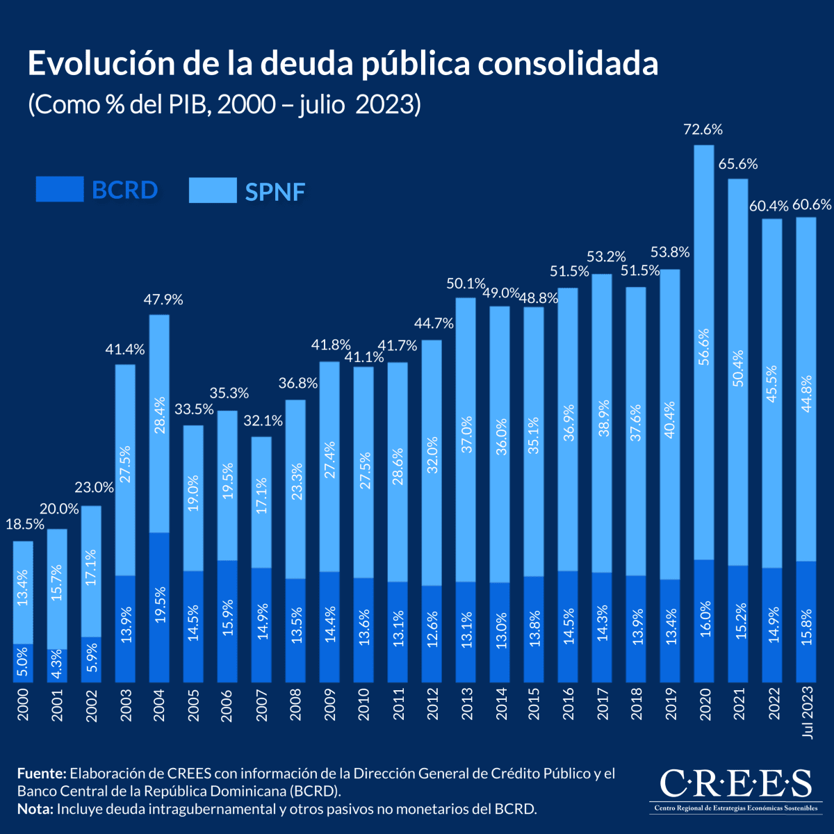 Al mes de julio de 2023 la deuda pública consolidada se ubicó en 60.6% del PIB; de los cuales un 44.8% correspondían a la deuda del SPNF y los restantes 15.8% a la deuda del BCRD.