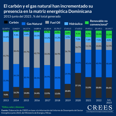 Vale la pena resaltar el incremento en la generación a base de gas natural, la cual pasó de 31.9% en 2013 a 40.9% en 2022. Otro cambio es el incremento en el uso de carbón, particularmente después de la entrada en operación de la Central Punta Catalina en 2019. Tanto el carbón como el gas han mantenido su participación casi invariable entre 2022 y junio de 2023. Mientras se producían estos cambios, se reducía la generación en base a fuel oil. En la actualidad solo representa el 12.5% de la generación.