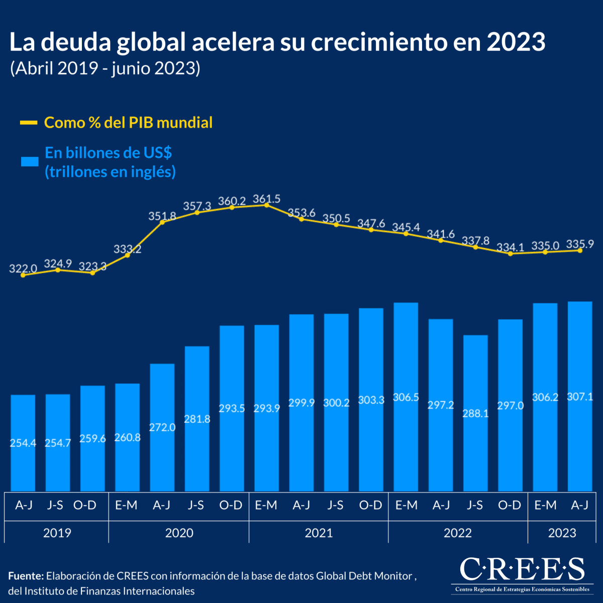 La deuda global (pública y privada), superó los US$307.1 billones (trillones en inglés) según datos del Instituto de Finanzas Internacionales. Este monto representa el 336% del producto interno bruto (PIB) global. Como se aprecia en el gráfico, la deuda global tiene tres trimestres consecutivos de crecimiento en términos absolutos, y dos creciendo como porcentaje del PIB.