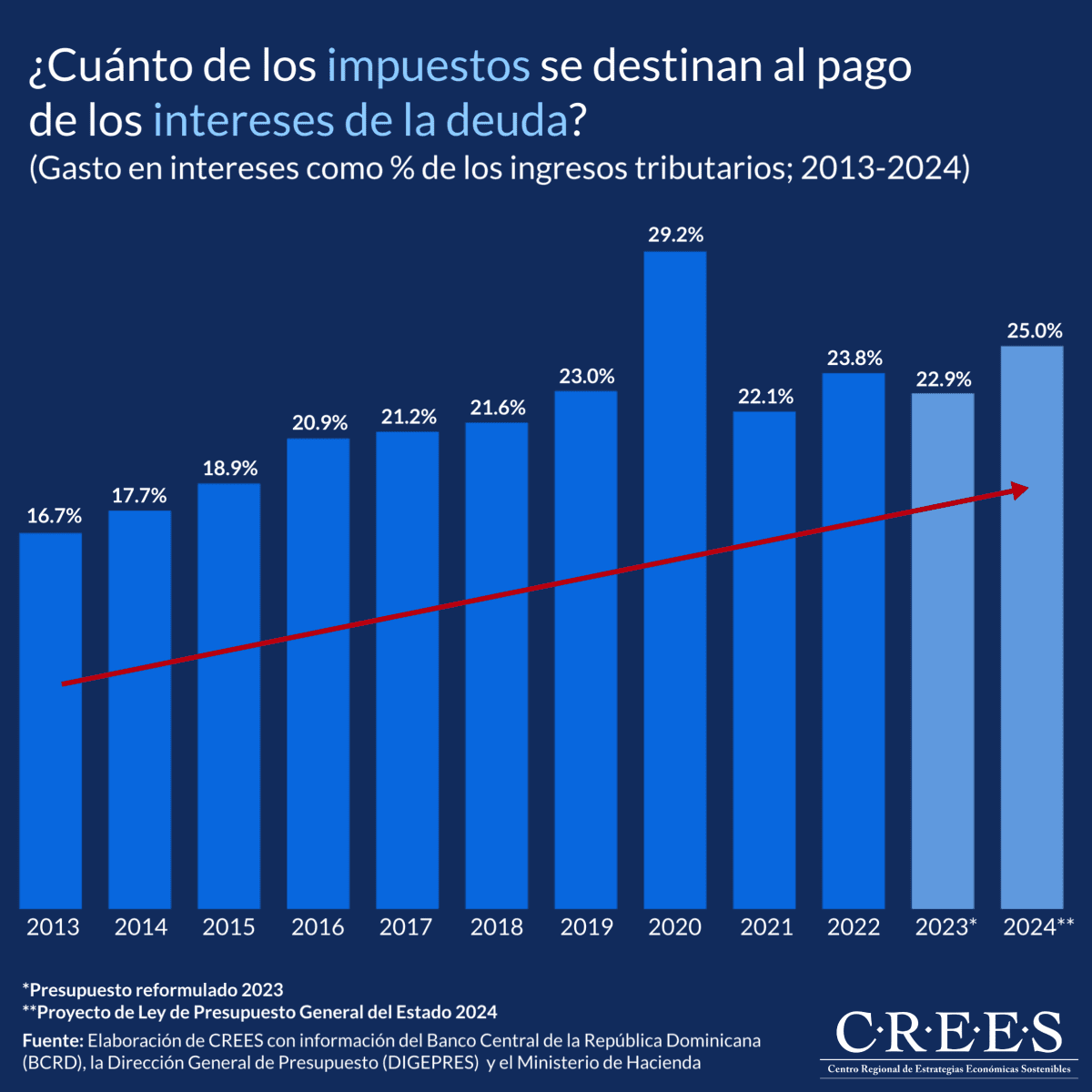 De forma histórica, hemos estado transitando por niveles cada vez más altos. La serie muestra el incremento desde 2013, cuando el valor alcanzó 16.7%. El próximo año, para el que se usan los datos del Proyecto de Ley de Presupuesto General del Estado 2024, el monto sería 25%.