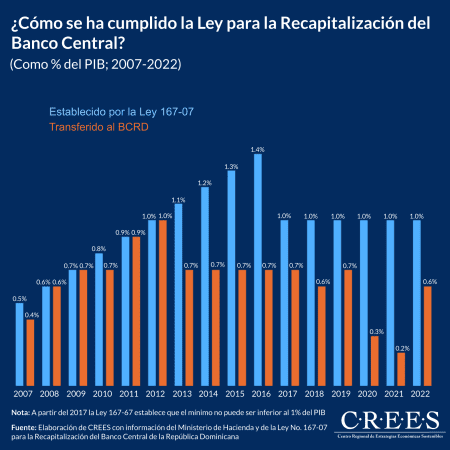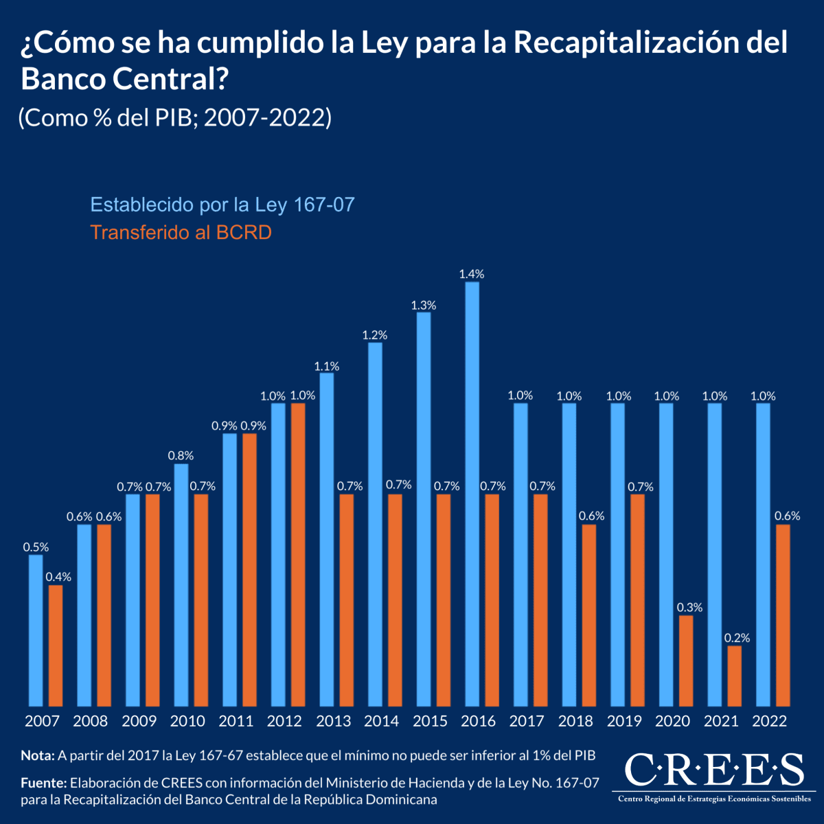 Al analizar la ejecución de esta ley podemos notar que solo se cumplió en 2008, 2009, 2011 y 2012. A partir del 2017, las leyes de presupuesto general del Estado han incluido modificaciones a la ley 167-07. Estas modificaciones han establecido obligaciones de transferencias entre 0.6% y 0.7%, inferiores al 1% del PIB dispuesto por la legislación. La realidad indica que el BCRD no ha contado con el apoyo necesario, en la mayoría de los años, para reducir sus pasivos.