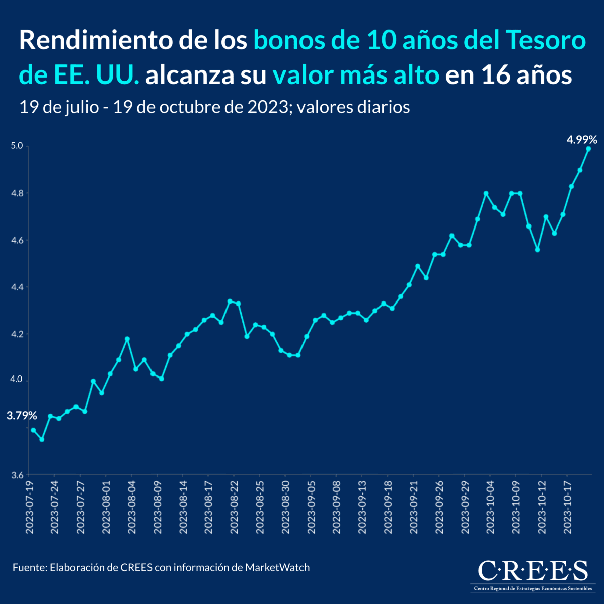 El jueves 19 de octubre del 2023 el rendimiento de los bonos de 10 años del Tesoro de los Estados Unidos (EEUU) cerró en 4.99%, el valor de cierre más alto desde el 25 de julio del 2007. En los últimos tres meses los rendimientos de los bonos del tesoro han mantenido un crecimiento constante, registrando un aumento de 120 puntos básicos al pasar de 3.79% a 4.99%.