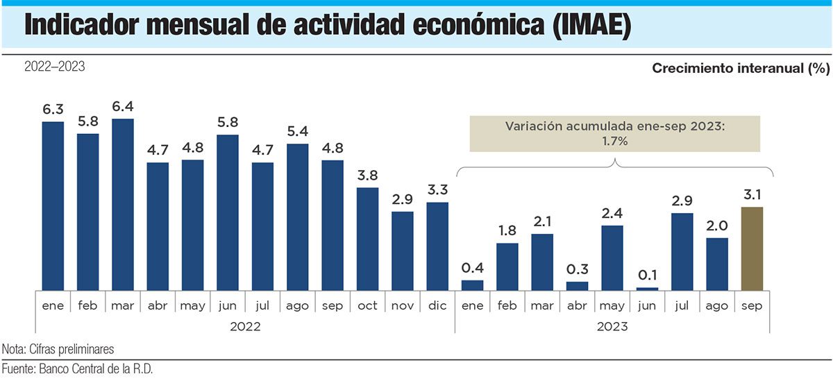A todo esto, las autoridades monetarias mantienen la proyección de un 3% de crecimiento para finales de 2023, a pesar de que era necesario crecer sobre el 7% mensual durante el último cuatrimestre. Sin embargo, al año sólo le quedan octubre, noviembre y diciembre. Economistas como Jaime Aristy Escuder proyectan que la economía podría crecer entre un 2.0% y 2.5%.