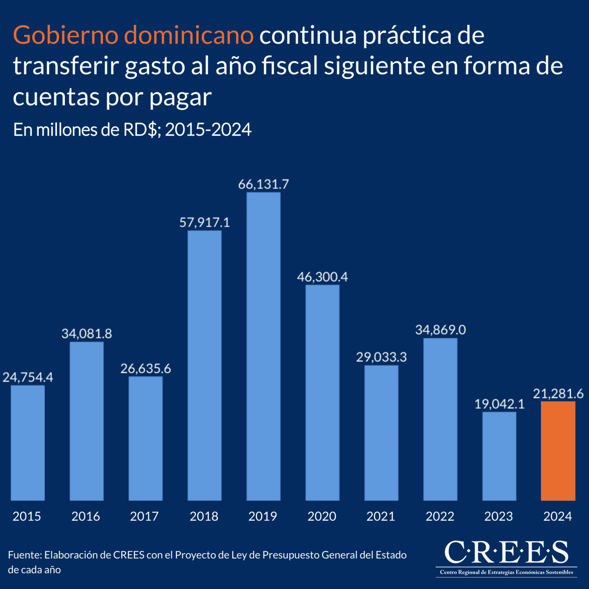 El gobierno de la República Dominicana continua la práctica de trasladar gastos al año fiscal siguiente mediante la utilización de cuentas por pagar. Este procedimiento implica la ejecución del gasto durante un periodo fiscal específico, pero su registro contable se realiza al momento de efectuar el pago. En el marco del Proyecto de Ley de Presupuesto General del Estado correspondiente al año 2024, se ha identificado la presencia de cuentas por pagar que ascienden a la suma de RD$21,281.6 millones. Este monto representa un incremento con respecto a la cifra presupuestada en el año 2023 de RD$2,239.5 millones.