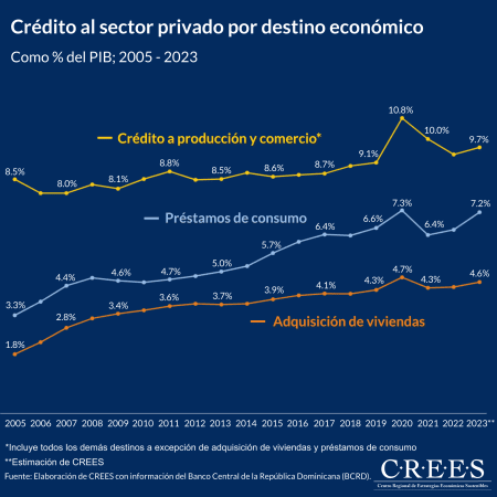 Un análisis del crédito otorgado por los intermediarios financieros al sector privado visto como porcentaje del PIB muestra que el crédito a producción y comercio pasó de 8.5% en 2005 a 9.7% en 2023; un aumento de solo 1.2 puntos porcentuales. Los préstamos de consumo pasaron de 3.3% a 7.2%, es decir, un aumento de 3.9 puntos porcentuales. Y el crédito a la adquisición de viviendas pasó de 1.8% a 4.6%, lo que significa un aumento de 2.8 puntos porcentuales. En términos absolutos los préstamos de consumo y el crédito de adquisición de viviendas han experimentado un aumento de 1275% y 1486% respectivamente, mientras que el crédito a producción y comercio ha tenido un aumento de 616%.