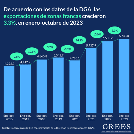 Entre enero y octubre de 2023 las exportaciones totales de bienes ascendieron a US$10,034.1 millones; de los cuales las de zonas francas representan más de la mitad (un 67.2%).