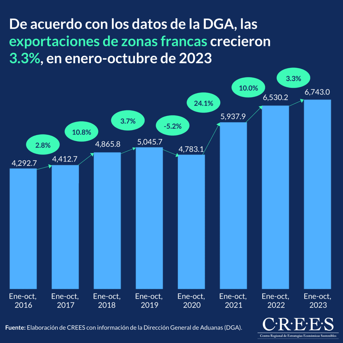 De acuerdo con los datos de la Dirección General de Aduanas (DGA), las exportaciones de zonas francas ascendieron a US$6,743.0 millones. Esto significa un aumento de US$212.8 millones en comparación con lo registrado en el mismo periodo del año 2022.
