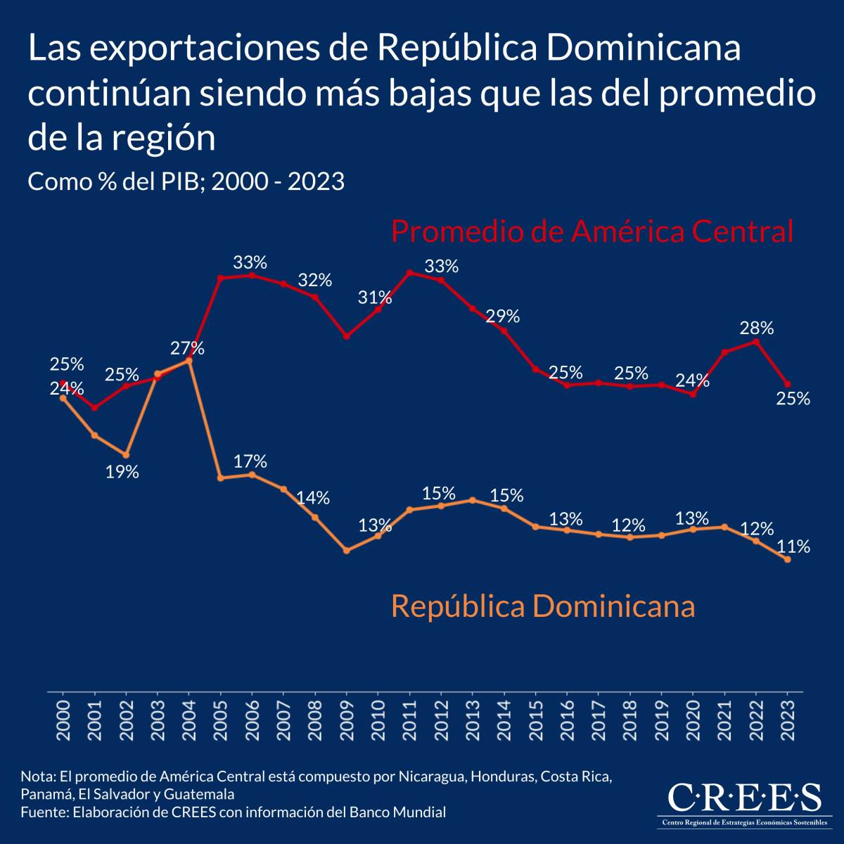 Las exportaciones de la República Dominicana, como proporción de su Producto Interno Bruto (PIB), han mostrado un desempeño inferior al promedio de América Central. En 2023, las exportaciones del país representaron un 10.65% del PIB, mientras que el promedio regional se situó en un 24.72%. Exceptuando un año particular, el porcentaje de exportaciones dominicanas ha estado constantemente por debajo del promedio de la región.