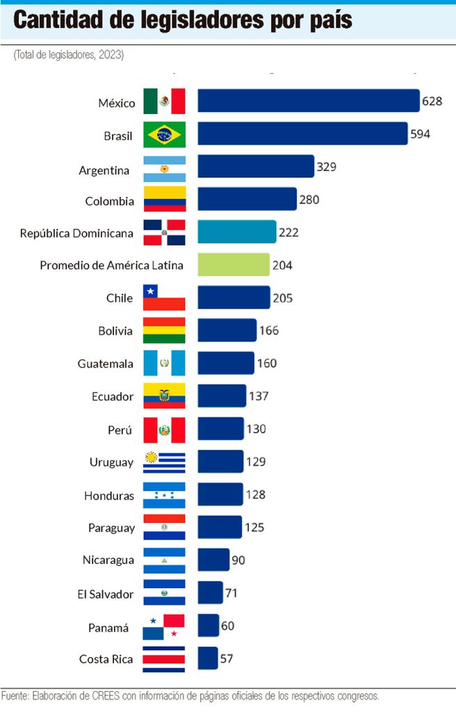 “Un elemento importante para analizar la dimensión de los distintos poderes legislativos de América Latina es la cantidad de legisladores”, indica el levantamiento de la firma consultora. “México (628), Brasil (594) y Argentina (329) son los países con mayor número de legisladores. En contraste, Costa Rica tiene el menor número con 57 legisladores”, agrega.