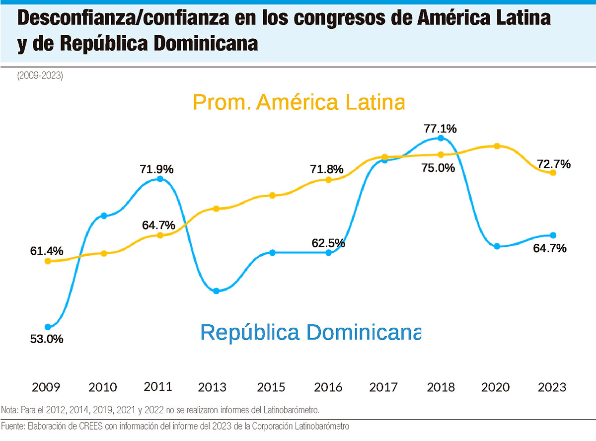 Sin embargo, según las cifras de Latinobarómetro, la satisfacción de las personas hacia los parlamentos de América Latina es cada vez menor. Señala que en el caso de República Dominicana la volatilidad de la confianza de las personas podría estar relacionado con el ciclo electoral y el cambio de una administración a otra. La desconfianza en República Dominicana paso de 53.0% en 2009 a 64.7% en 2023.