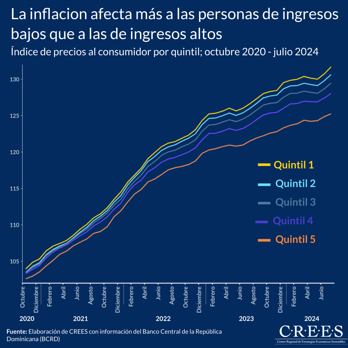 En la República Dominicana la inflación interanual desde julio de 2023 hasta julio de 2024 fue de 3.54% siendo de las tasas más bajas en los últimos años, pero esto no se refleja de la misma forma para cada sección de la sociedad dominicana, llegando a ser más afectados los grupos con ingresos más bajos que los que poseen ingresos altos.