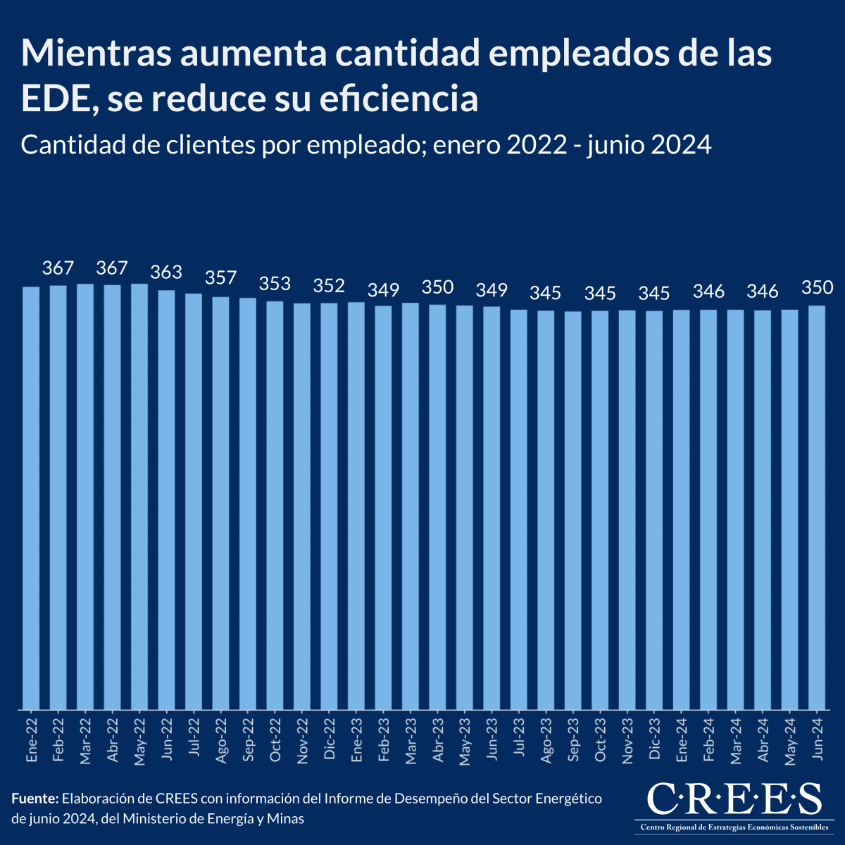 Una manera de evaluar la eficiencia de estas empresas es comparando la cantidad de empleados con los clientes que atienden. En la gráfica, se observa una disminución en la eficiencia, que pasó de 366 clientes por empleado en enero de 2022 a 350 en junio de 2024, lo que implica una reducción del 4.5%. Edenorte fue la que más sufrió este retroceso, con una disminución de eficiencia del 9.7%, seguida por Edesur con una reducción del 2.2%, y Edeeste con un leve retroceso del 0.2%.