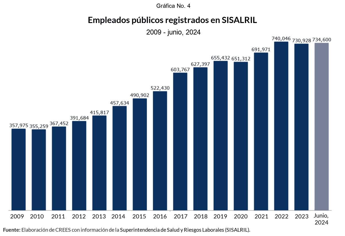 Los datos de la SISALRIL muestran un incremento de cotizantes, o empleados formales, de 16.8% entre 2020 y junio de 2024. El mayor aumento se verificó en los empleados privados, 18.6%; mientras que el empleo público creció 12.8%. El total de empleados públicos con respecto al total de empleados formales fue 30.8%, tanto en 2020 como en 2022, a junio de 2024 se situó en 29.7%. Todavía sigue siendo una cifra alta, bajo los parámetros históricos.