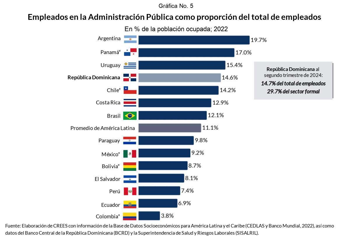 El siguiente gráfico muestra que República Dominicana ocupa el cuarto puesto entre los países que más empleados tienen del total de ocupados de la economía, incluyendo formales e informales. Las estadísticas son publicadas por el CEDLAS y corresponden a 2022. En el recuadro, mostramos los datos actualizados a junio de 2024, y se aprecia un ligero aumento. Los datos del total de empleados provienen de la encuesta realizada por el Banco Central de la República Dominicana.