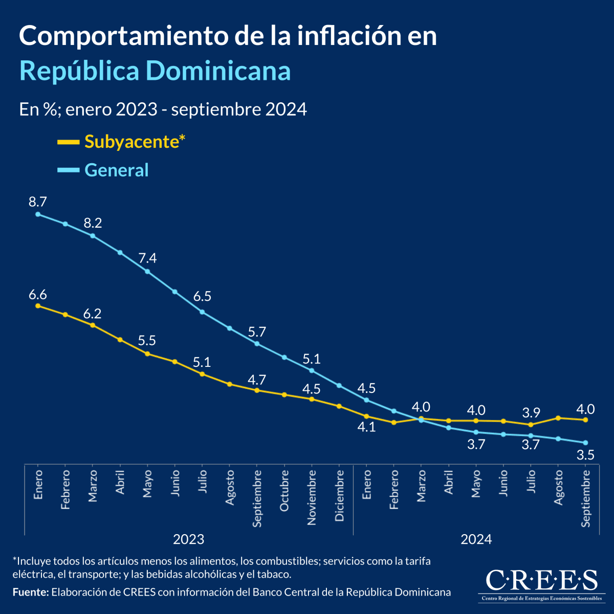 Entre enero de 2023 y septiembre de 2024, según las cifras oficiales, la inflación en República Dominicana ha mostrado una tendencia a la baja tanto en su componente general como en la inflación subyacente. La inflación general, que incluye todos los bienes y servicios, registró en un elevado 8.7% en enero de 2023, pero ha experimentado una caída sostenida, ubicándose en 3.5% para septiembre de 2024. Este descenso refleja una desaceleración considerable en el ritmo de crecimiento de los precios, lo que indica que las presiones inflacionarias generales son inferiores. Lo anterior implica que los precios continúan incrementándose, aunque a una tasa menor, y el peso dominicano continúa perdiendo valor.