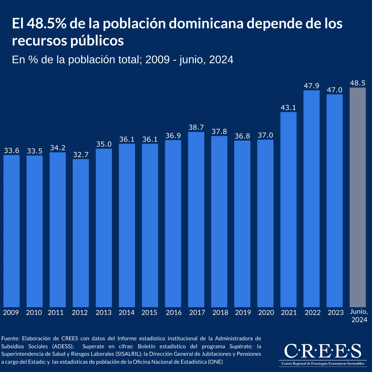 Este patrón de crecimiento de los dependientes de los recursos públicos ha sido una tendencia sostenida desde 2009. En ese año, el porcentaje de la población dependiente de recursos públicos era del 33.6%, cifra que ha ido aumentando con el tiempo hasta alcanzar el 48.5% en junio de 2024. Este crecimiento no solo refleja la expansión de los programas sociales y del empleo público, sino también un cambio estructural en la economía del país, donde una porción significativa de la población depende directamente del Estado para su subsistencia.