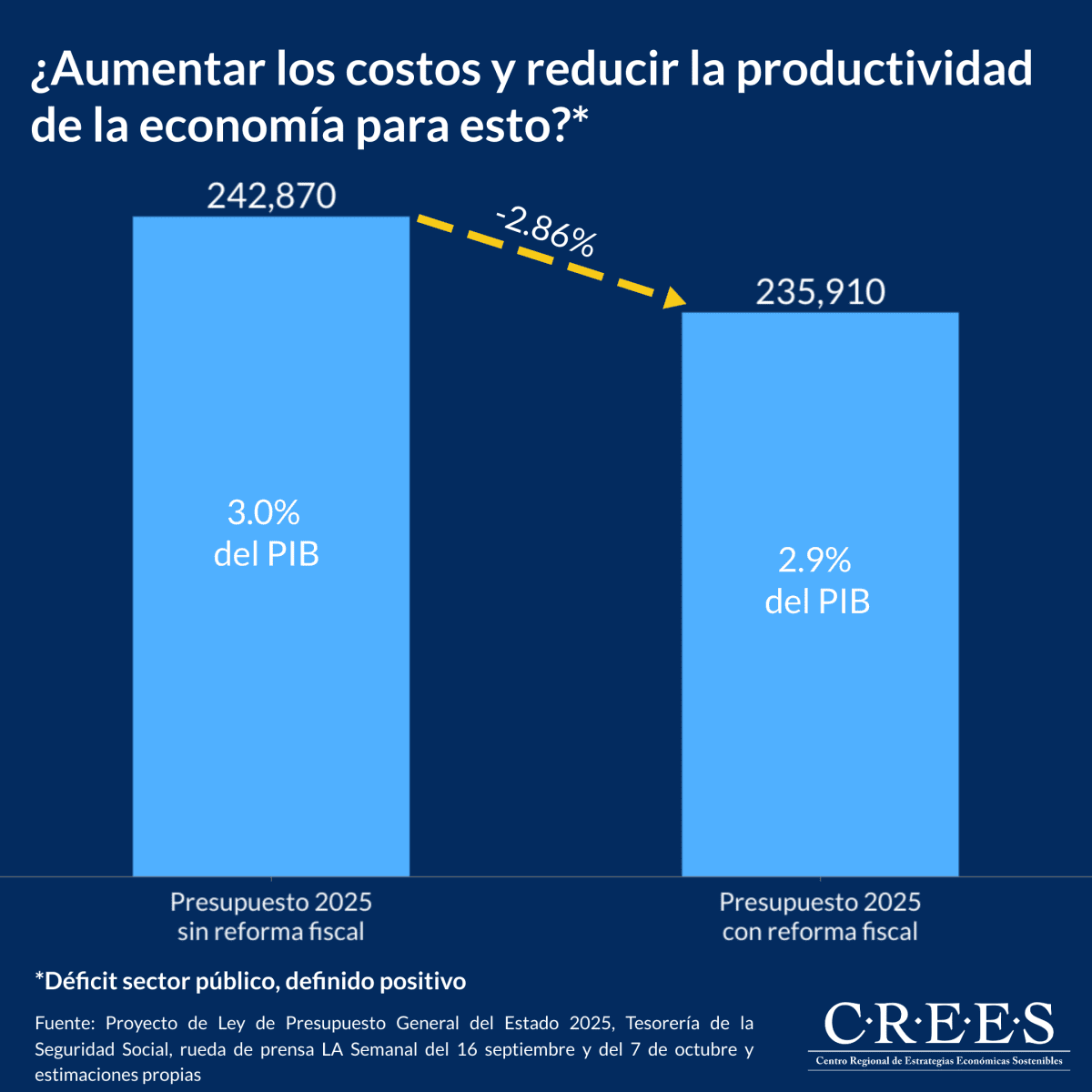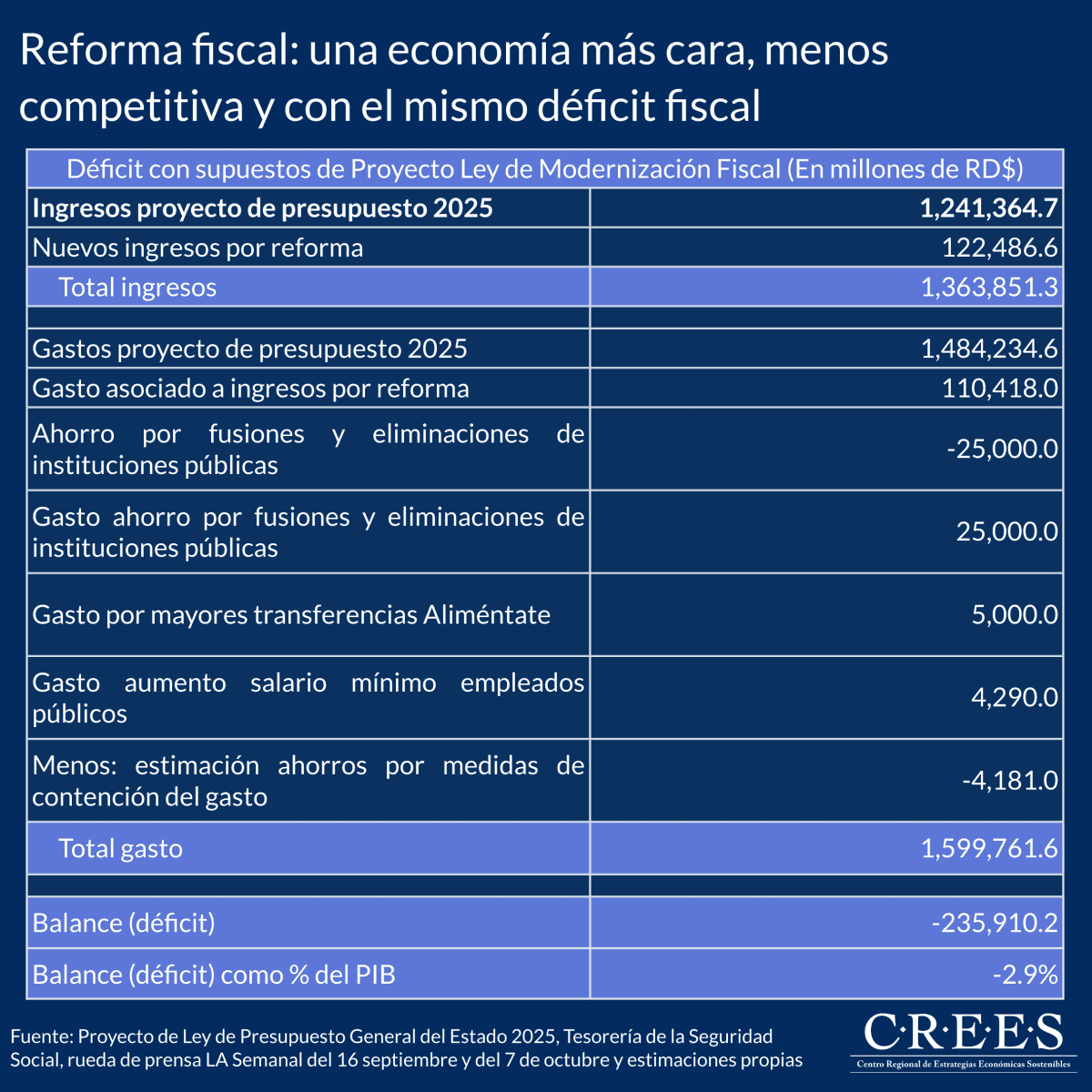 La tabla muestra que el déficit fiscal de 2025 permanecería igual al del proyecto de presupuesto. El déficit esperado, tanto sin reforma como con reforma andaría entorno al 3.0% del PIB. Se pretende incrementar las recaudaciones en más de RD$122,000 millones, con un aumento del gasto de más de RD$110,000, sin incluir aumentos en los programas Aliméntate y en los salarios mínimos de los servidores públicos. Y las economías que se pudieran conseguir por fusiones y eliminaciones de entidades estatales no serían ahorros.