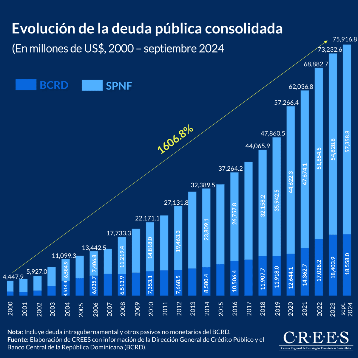 La deuda pública consolidada (incluyendo deuda intergubernamental) a septiembre de 2024 ascendió a US$75,916.8 millones. Este monto está compuesto por la deuda del Sector Público No Financiero (SPNF), que fue de US$57,358.8 millones, y la deuda del Banco Central de la República Dominicana (BCRD), que representó US$18,558.0 millones.