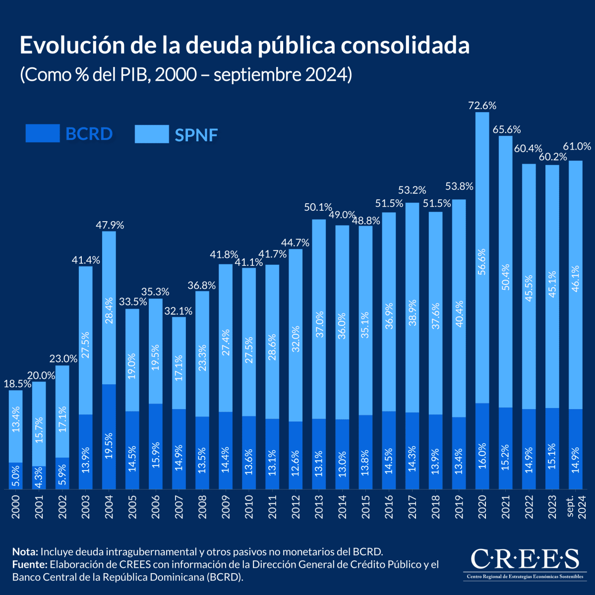 Al mes de septiembre de 2024 la deuda pública consolidada se ubicó en 61.0% del PIB; de los cuales un 46.1% correspondían a la deuda del SPNF y los restantes 14.9% a la deuda del BCRD.