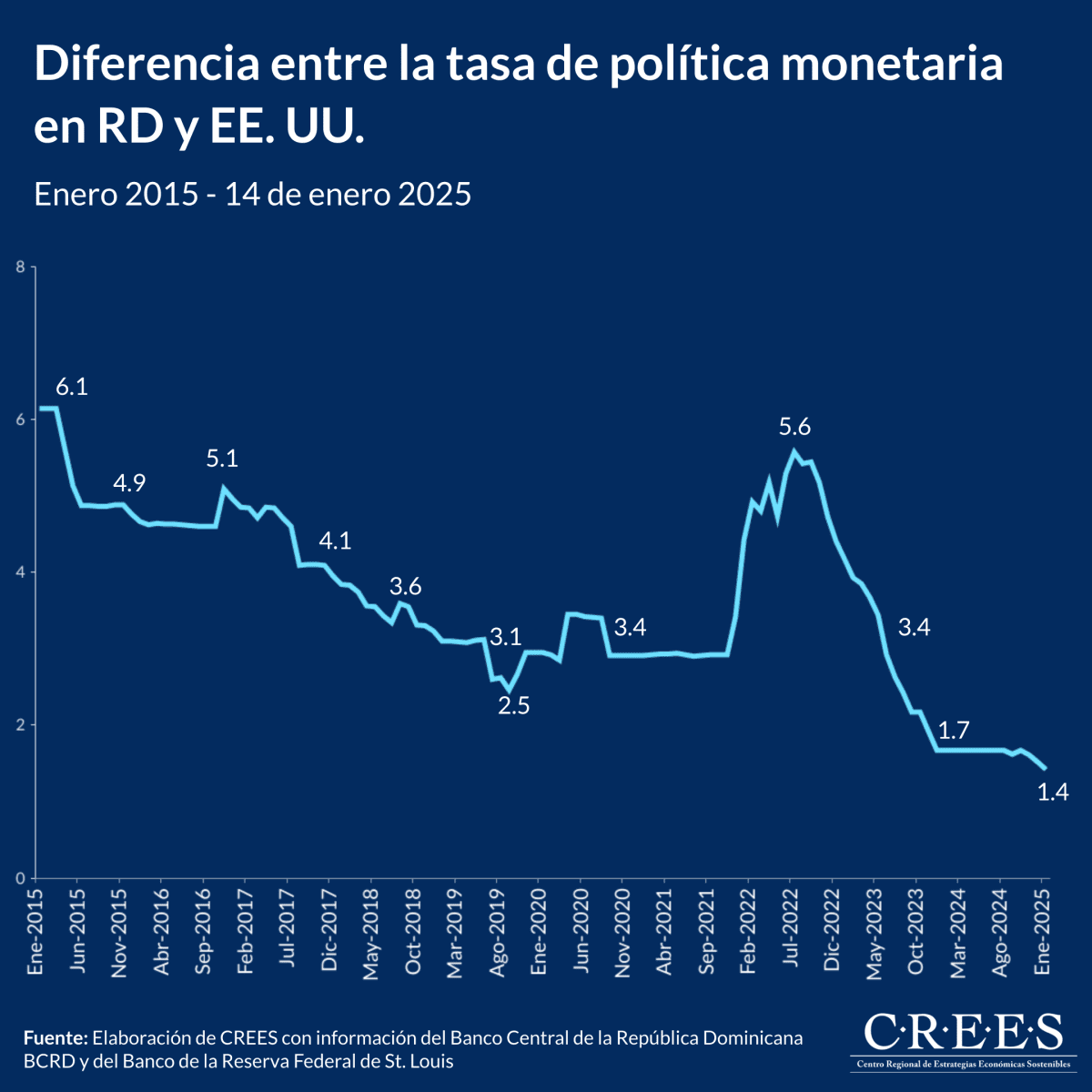 Entre enero de 2015 y enero de 2025, la Tasa de Política Monetaria (TPM) de República Dominicana ha mantenido niveles más altos en comparación con Estados Unidos. Sin embargo, el spread —la diferencia entre ambas tasas— ha disminuido significativamente desde mediados de 2023. En enero de 2025, la TPM en República Dominicana se ubicó en 5.75%, mientras que en Estados Unidos es de 4.33%, es decir, el promedio del rango de 4.25% y 4.50%. Este contraste refleja un diferencial más reducido en comparación con otros periodos históricos.