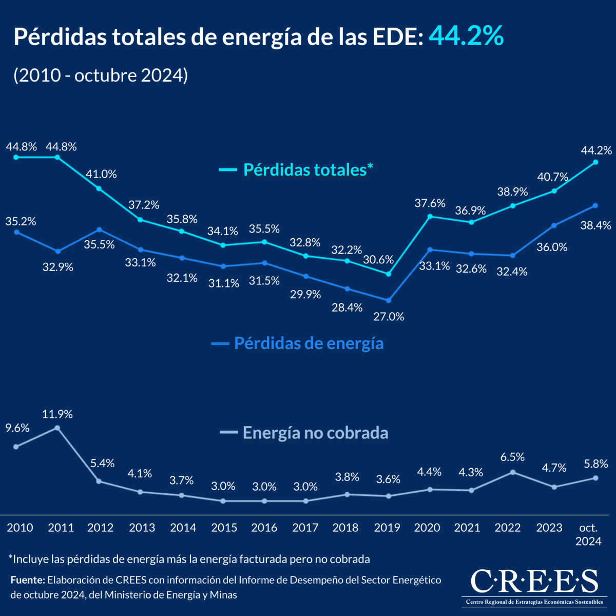 A octubre de 2024 las pérdidas totales acumuladas de las empresas distribuidoras de electricidad (EDE) alcanzaron el 44.2%. Es decir, por cada 100 GWh de energía comprada las EDE perdieron el equivalente a 44 gigavatios-hora (GWh). Lo que equivale a US$1,111 millones solo por pérdidas de energía comprada y no cobrada a los usuarios. Esto según el último informe de desempeño elaborado por el Ministerio de Energía y Minas.